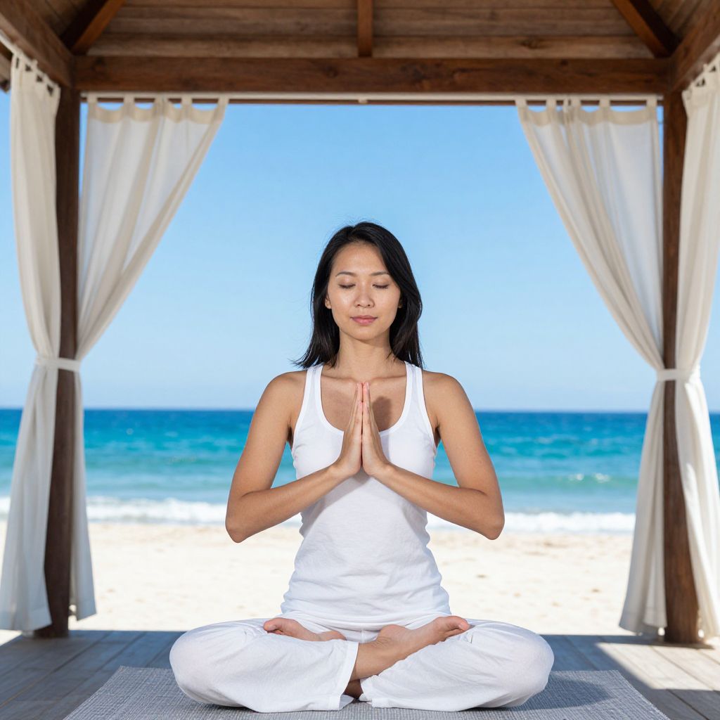 A photograph of an Asian woman with a slim build, dark hair, and fair skin, sitting in a white tank top and pants, meditating on her knees with hands in a prayer position. She's under a wooden pavilion with white curtains, overlooking a stunning, clear blue ocean and sandy beach. The lighting is bright, highlighting her peaceful expression.