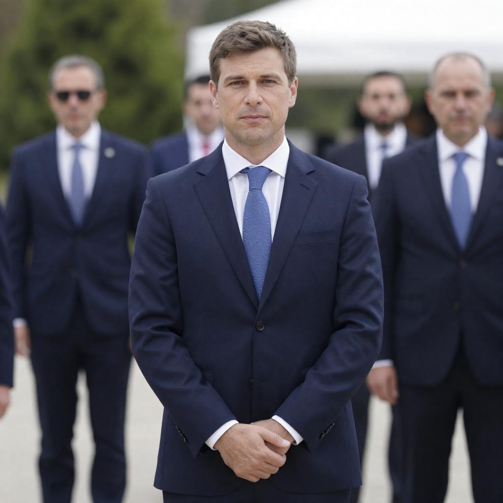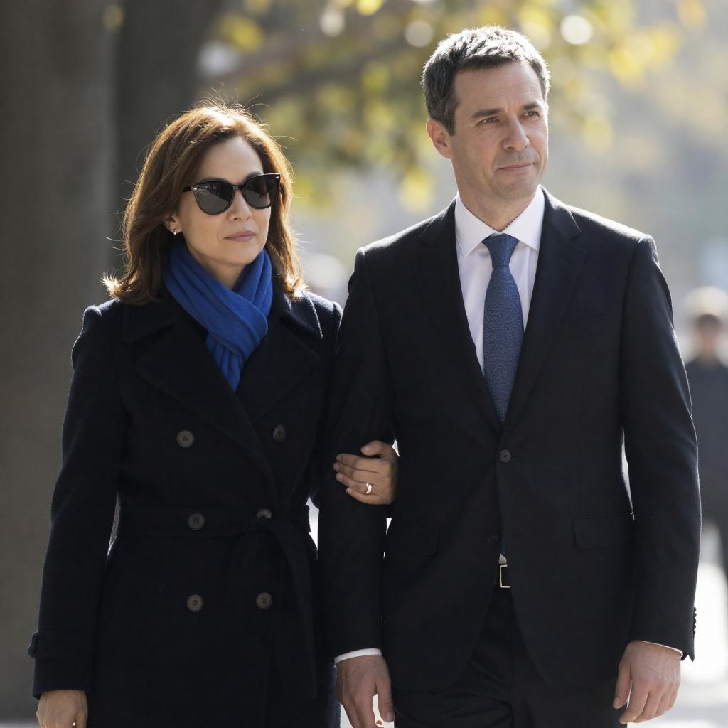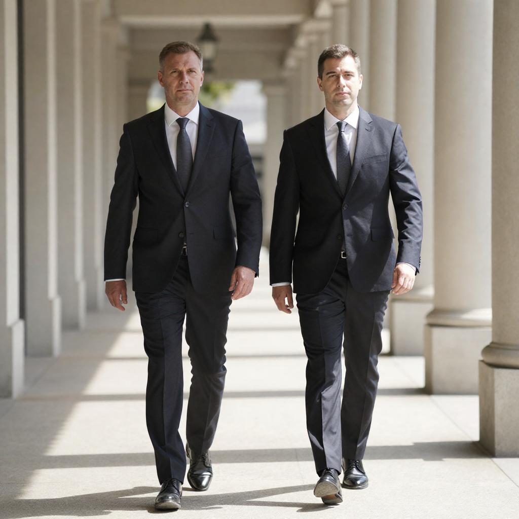 Photograph of two men in dark suits walking side by side in a sunlit, covered walkway with stone columns. Both men have short brown hair, wear white shirts and dark ties, and look ahead. The background shows a long corridor with bright light and shadows.