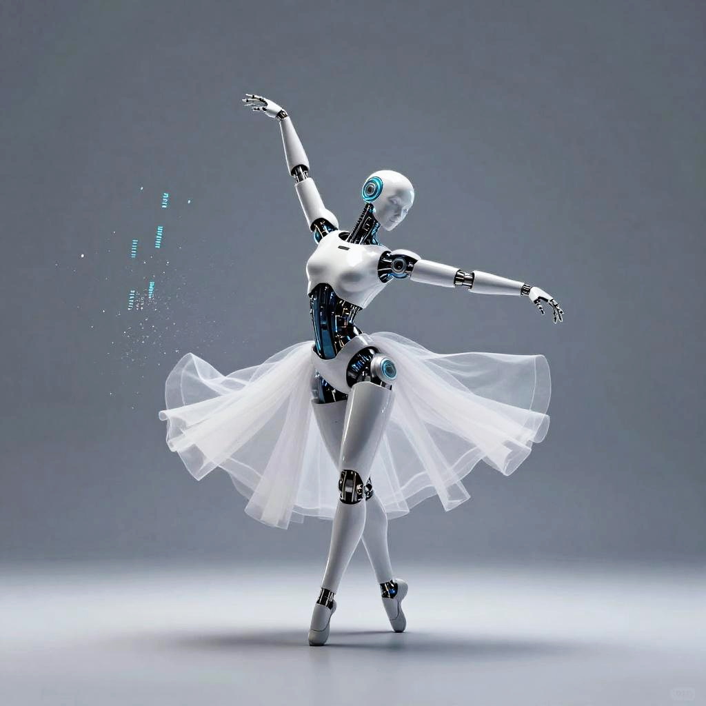 Pretty futuristic ballerina android, dynamic pose, delicate details, digital painting by Rossdraws, soft brush strokes, impressionist style, graceful elegance.