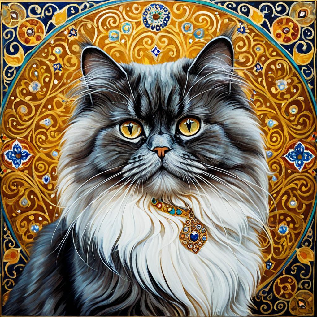A captivating, richly detailed portrait of a Persian Cat, rendered in the evocative and intricate style of Gustav Klimt. This masterful composition showcases the charming characteristics of the Persian Cat, framed by swirling motifs and adorned with vibrant, stylized elements. The image is captured using a high-quality Mirrorless camera, paired with a lens renowned for its exceptional sharpness and beautiful rendering of colors. The camera settings ensure perfect focus on the Persian Cat while softly blurring the ornate background, reminiscent of Gustav Klimt's signature style. The composition is further enhanced by soft, pastel tones of soft, natural lighting, creating a truly unique and enchanting work of art.