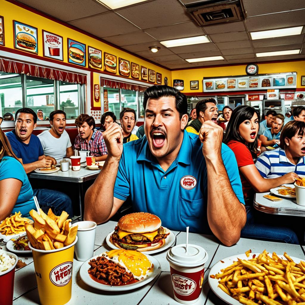 Realistic photo.Fast food breakfast country style diner, fast eating, gluttony, Herbert Block cartoon, hyper-realistic, messy, colorful, detailed characters, exaggerated facial expressions, chaotic atmosphere, vibrant colors, exaggerated proportions, comic, caricature, high quality, hyper-realism, cartoon style, bustling, chaotic lighting