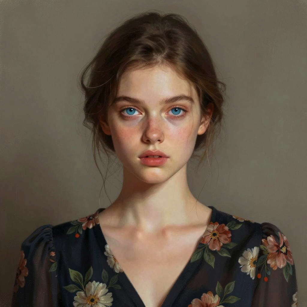 A beautifully stylized digital portrait of a young woman with striking blue eyes and delicate facial features. She is wearing a dark blouse adorned with a floral pattern featuring soft colors. The image combines realistic digital painting techniques with illustrative elements, set against a textured neutral background. Soft lighting enhances her contemplative expression.