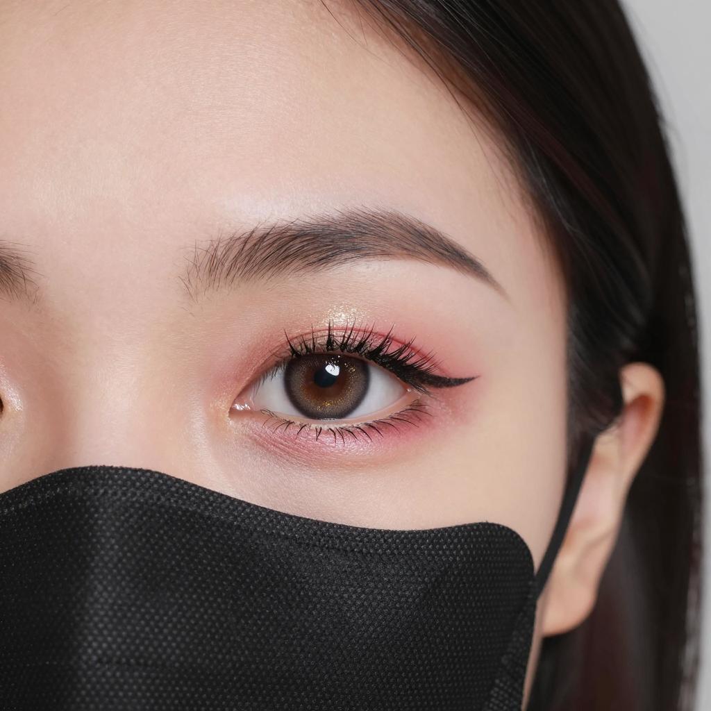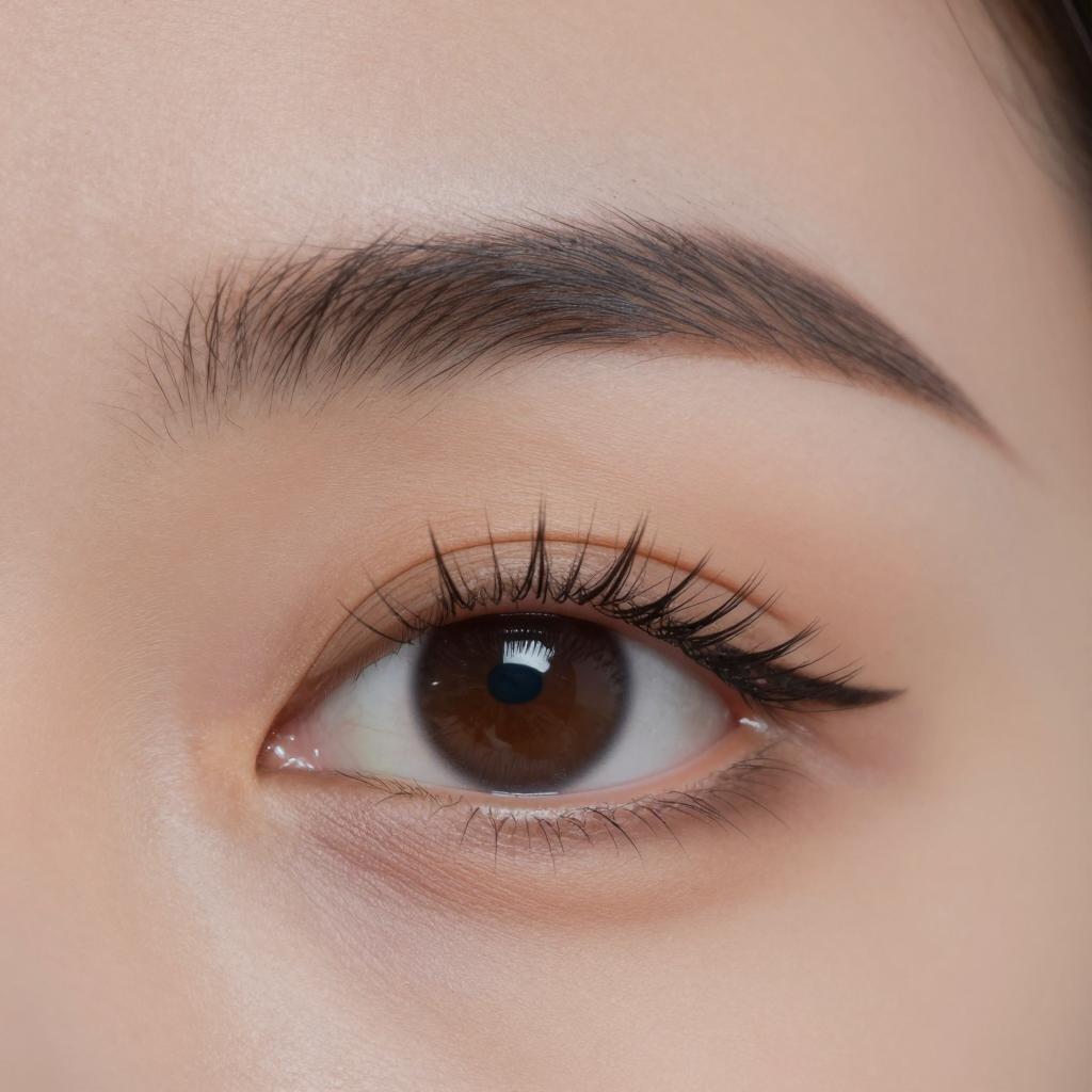 Close-up photograph of a person's eye. Dark brown eye with long, thick, black eyelashes. Well-defined, dark brown eyebrow arches above the eye. Smooth, tan skin. White sclera is visible. Eyelid has subtle, light brown shadow. Eye looking slightly upward.