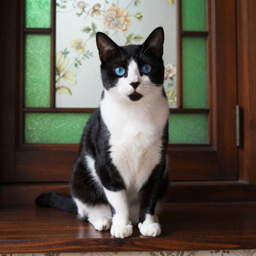 Photograph of a black and white cat sitting on a white floor in the bottom left corner. The background features a bright yellow door on the left and vibrant blue metal beams on the right, creating a striking contrast. The image has a high-contrast, almost surreal style with bold colors and sharp lines.