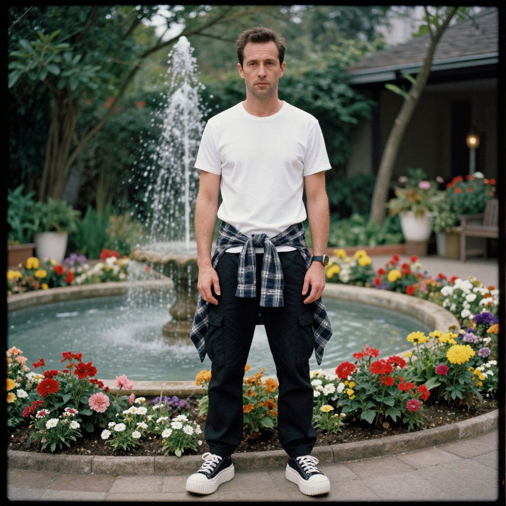 A man, classic white crew neck t-shirt, black cargo pants, chunky platform sneakers, plaid flannel shirt tied around the waist, standing in a lush garden courtyard, cascading water feature, colorful flower beds, daguerreotype film style, relaxed expression, soft light filtering through leaves. Man has masculine face and piercing eyes