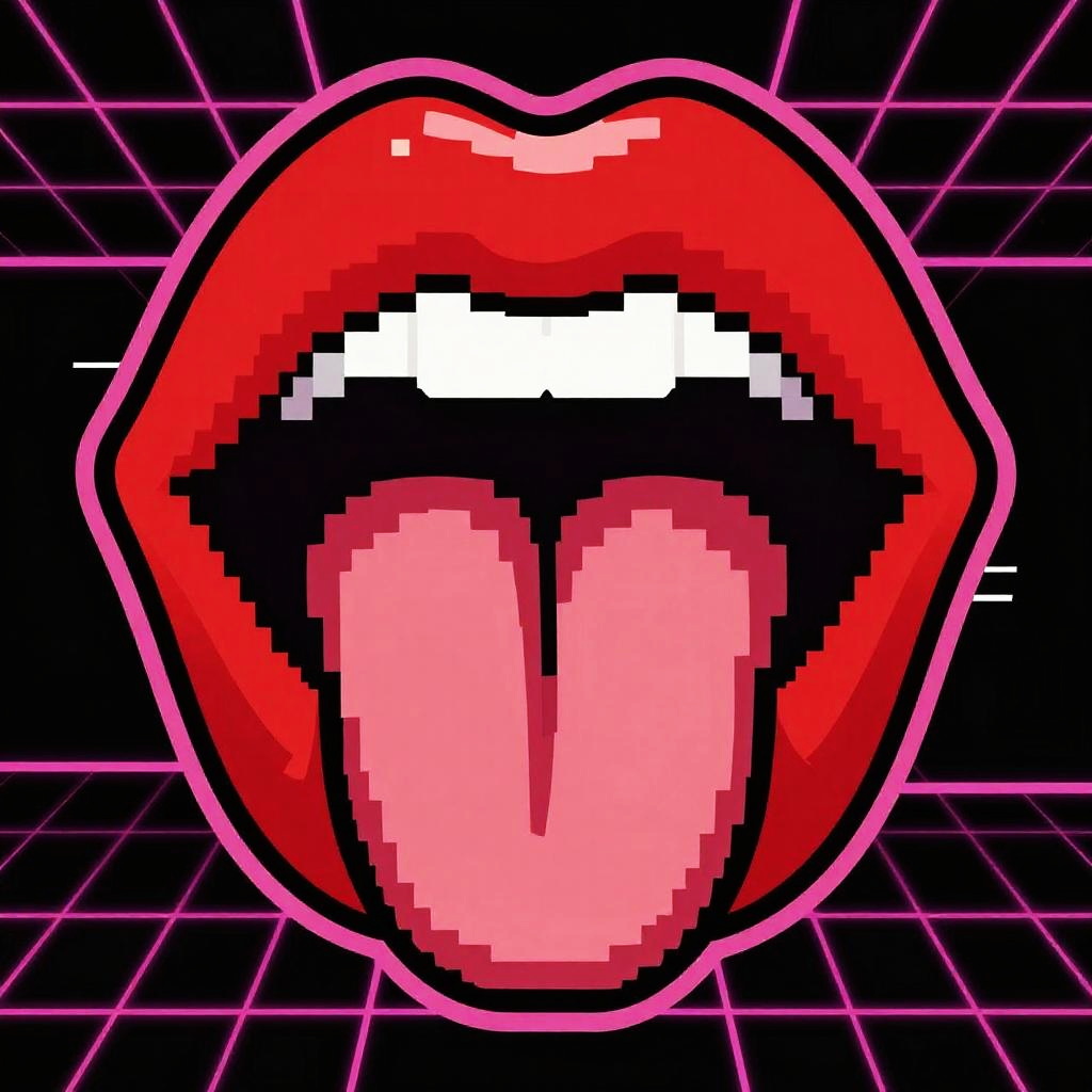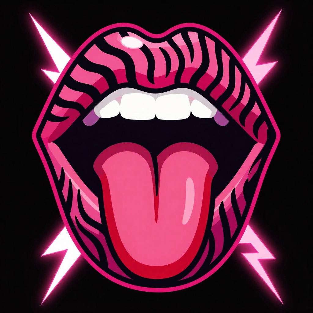 A bold pop art poster of lips with tongue sticking out, lips covered in crazy checker scribbles, bright red tongue with crisp white highlights, thick black outlines, neon punk vector art, set against dark charcoal with vibrant purple circuit patterns, crisp vector edges, strong graphic composition, generous negative space, high resolution, print-ready, no text