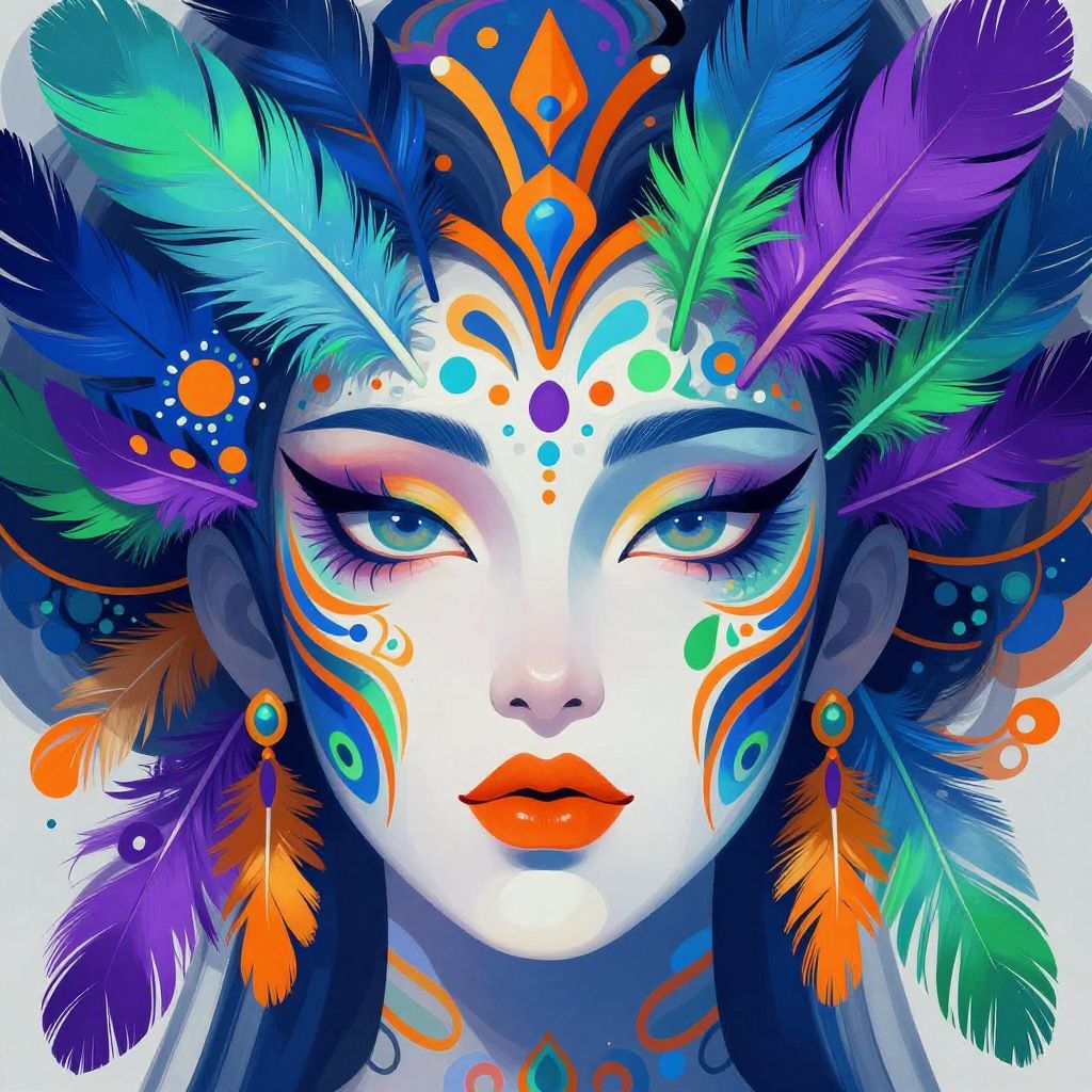 Digital illustration of a white-faced woman with vibrant, colorful feathered headdress, orange-red lips, and intricate face paint in blue, orange, and