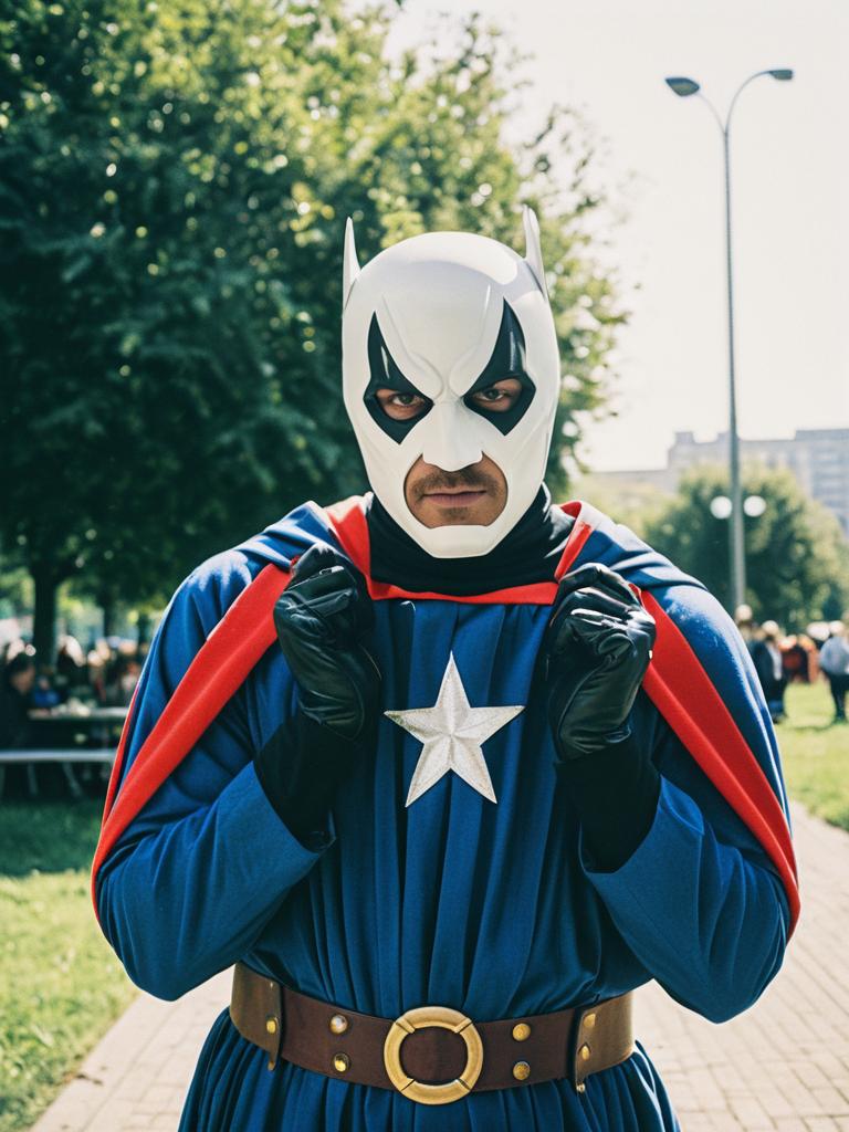 Man in Supper costume, outdoor cosplay portrait in bright daylight