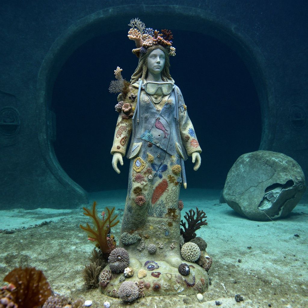 The image presents a captivating underwater scene featuring a highly detailed, hyper-realistic statue of a young woman, seemingly prehistoric, adorned with a crown of coral, algae, and seaweeds. The statue, covered in basalt rock and prehistoric drawings, appears aged and damaged, with a parka raincoat and diving mask adding to its antiquated appearance. Surrounding the statue, the floor is littered with various artifacts, including coral and algae, emphasizing the underwater setting. In the background, a submarine cave in the abyss of the ocean is visible, with an ancient broken rock in basalt at the bottom, further enhancing the prehistoric ambiance. The overall composition is a harmonious blend of natural and man-made elements, creating a sense of ancient history and mystery.