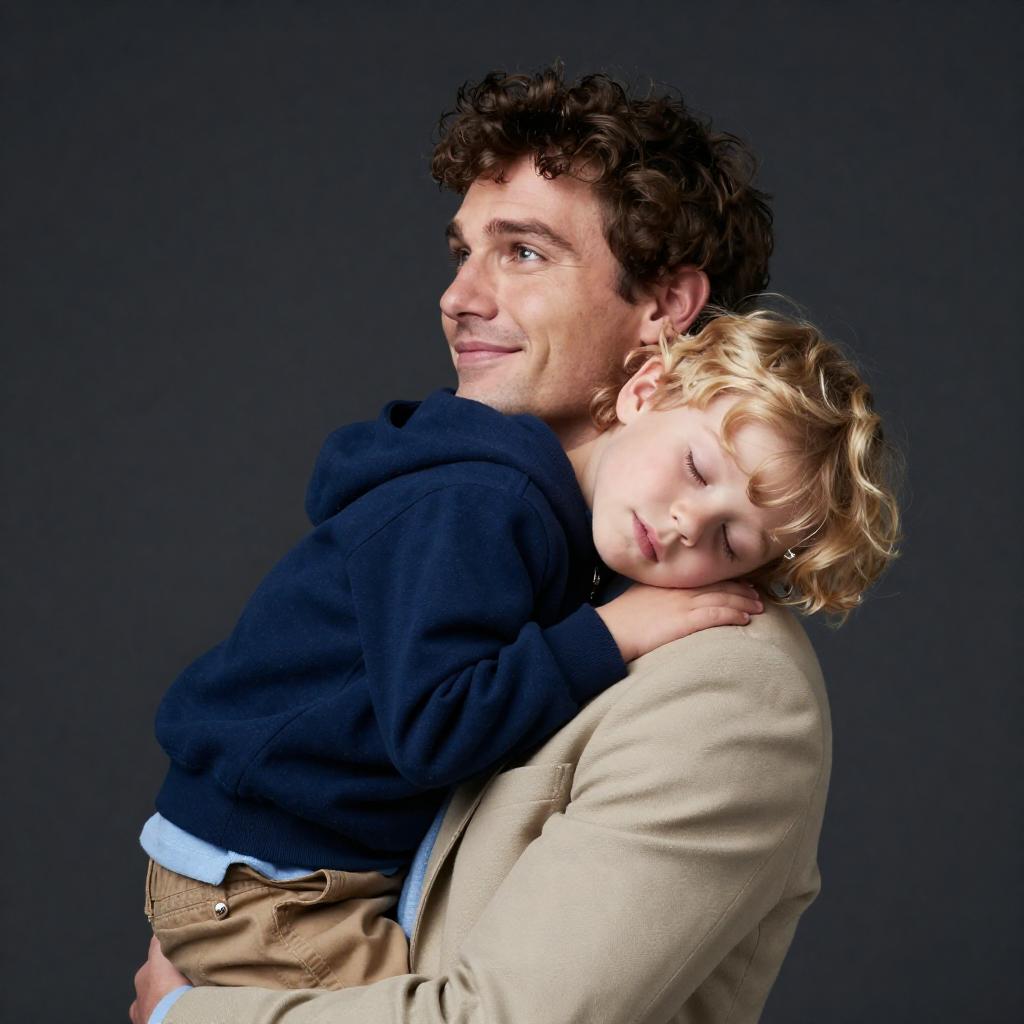 Photograph of a man with curly brown hair, wearing a beige blazer and light blue shirt, carrying a blonde child with curly hair in a blue jacket. The man looks to the left, smiling, while the child rests their head on his shoulder, eyes closed. Dark background.