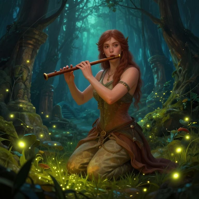 Satyr bard female playing a wooden flute in a mystical forest clearing, surrounded by glowing fireflies and ancient ruins, detailed fantasy art, vibrant colors, magical atmosphere