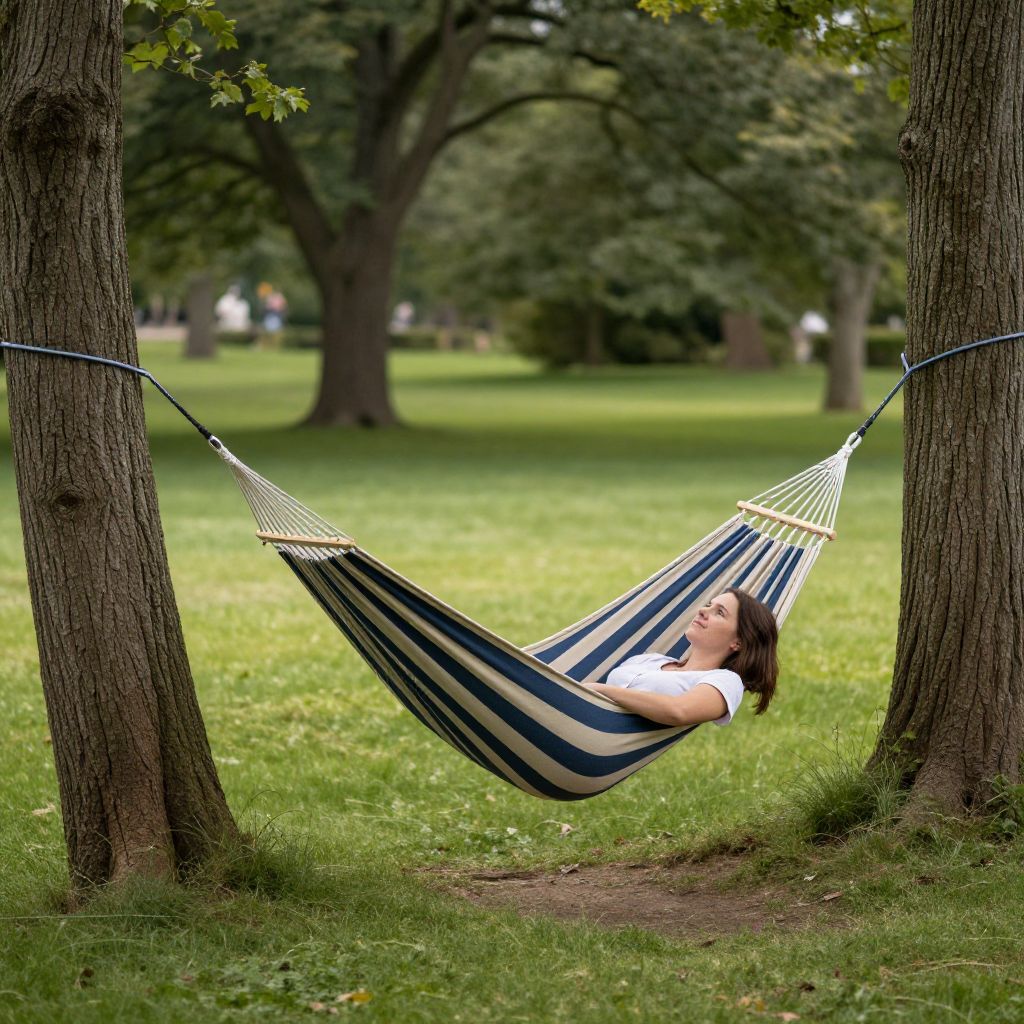 Woman relaxing in a striped hammock suspended between two trees in a serene park setting, surrounded by lush green grass and tall trees in the background.