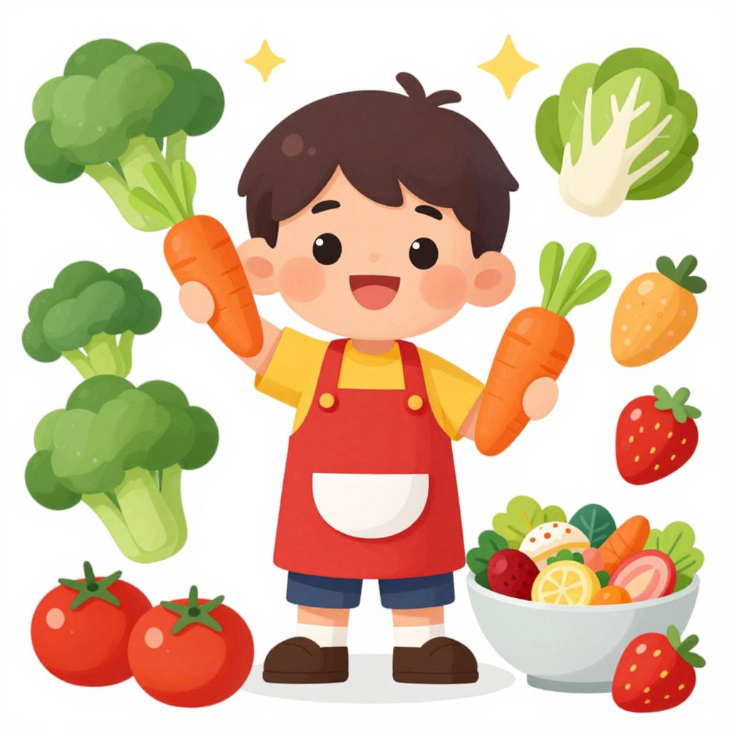 Cartoon boy in red apron, yellow shirt, holding carrots, surrounded by broccoli, strawberries, tomatoes, and mixed veggies bowl, smiling.