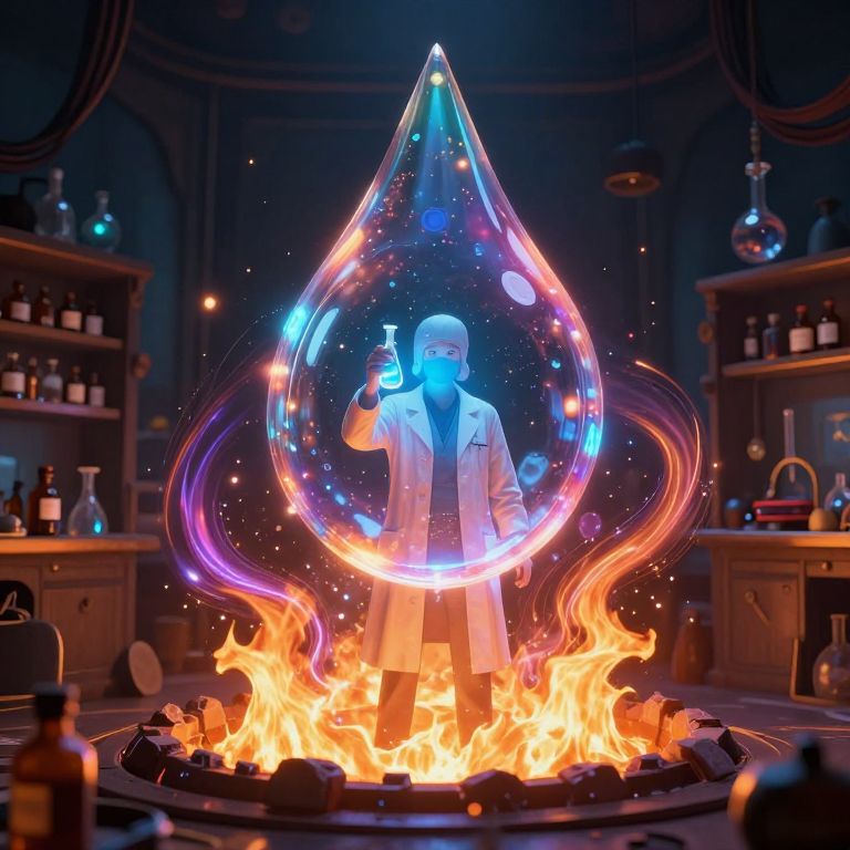 Scientist stands within a colossal, luminous droplet of liquid light suspended above a fiery pit, surrounded by swirling particles and vibrant energy trails, as they hold a glowing vial amidst a dimly lit alchemical workshop filled with shelves of bottles and equipment.