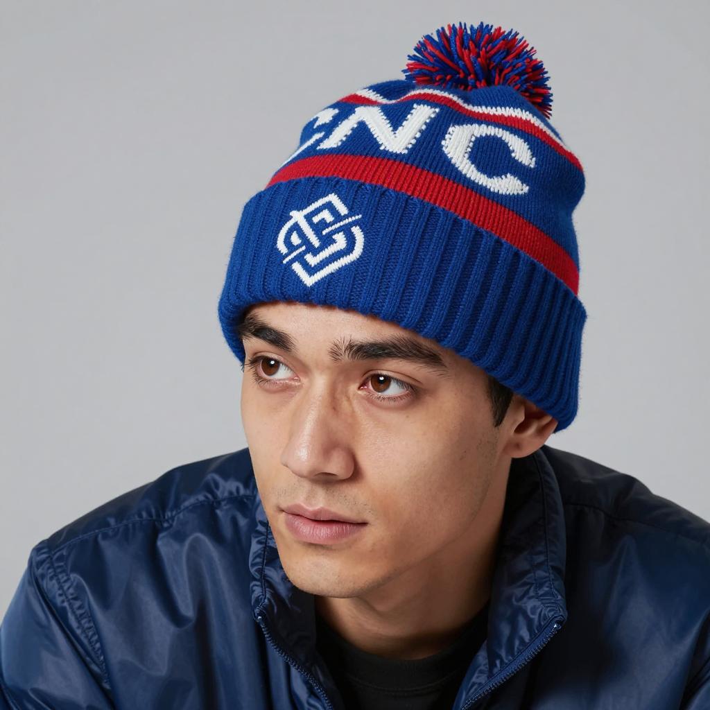 Man with light skin, brown eyes, and short dark hair wears a blue and red knit beanie with a white emblem, and a shiny blue jacket. He leans forward, looking intently to the side. Background is plain and grey.