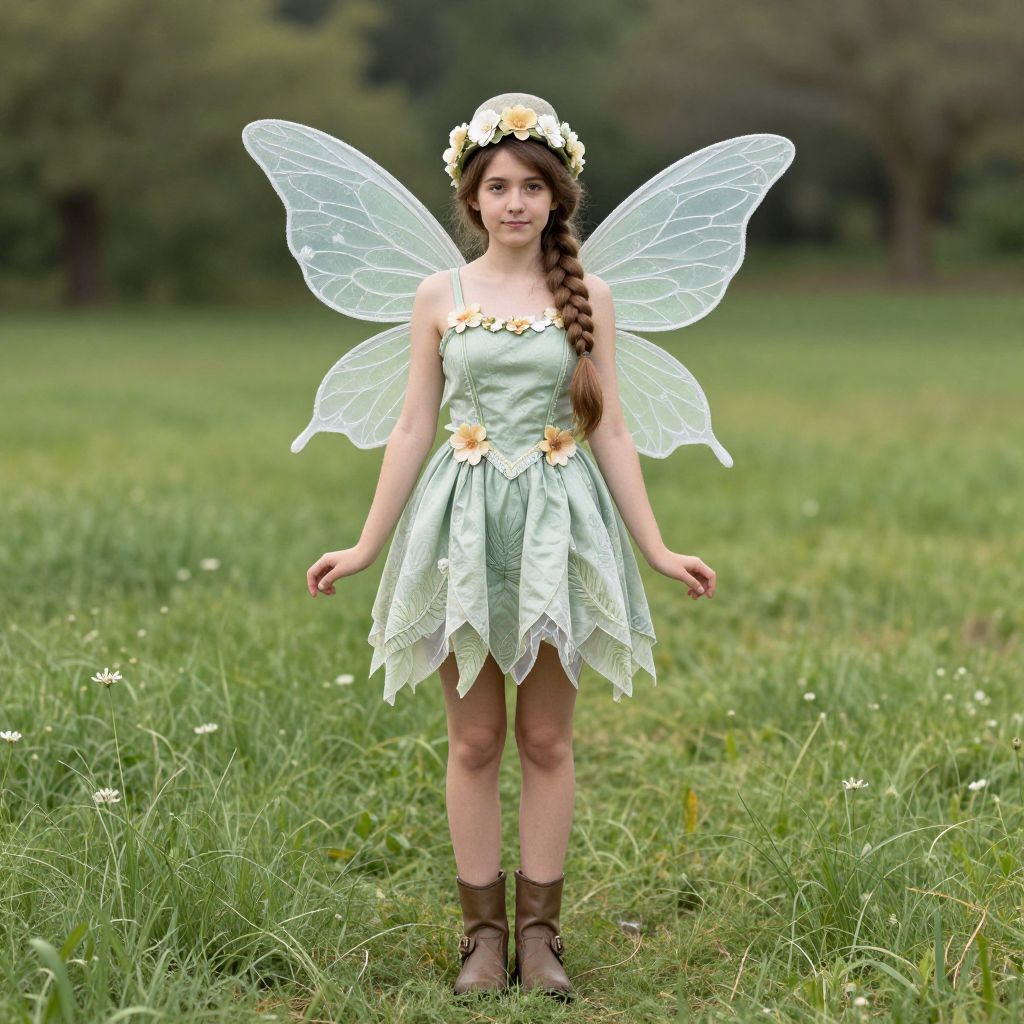 Merryweather fairy costume, 1girl, solo, wings, hat, braid, fairy wings, dress, flower, brown hair, long hair, fairy, grass, boots