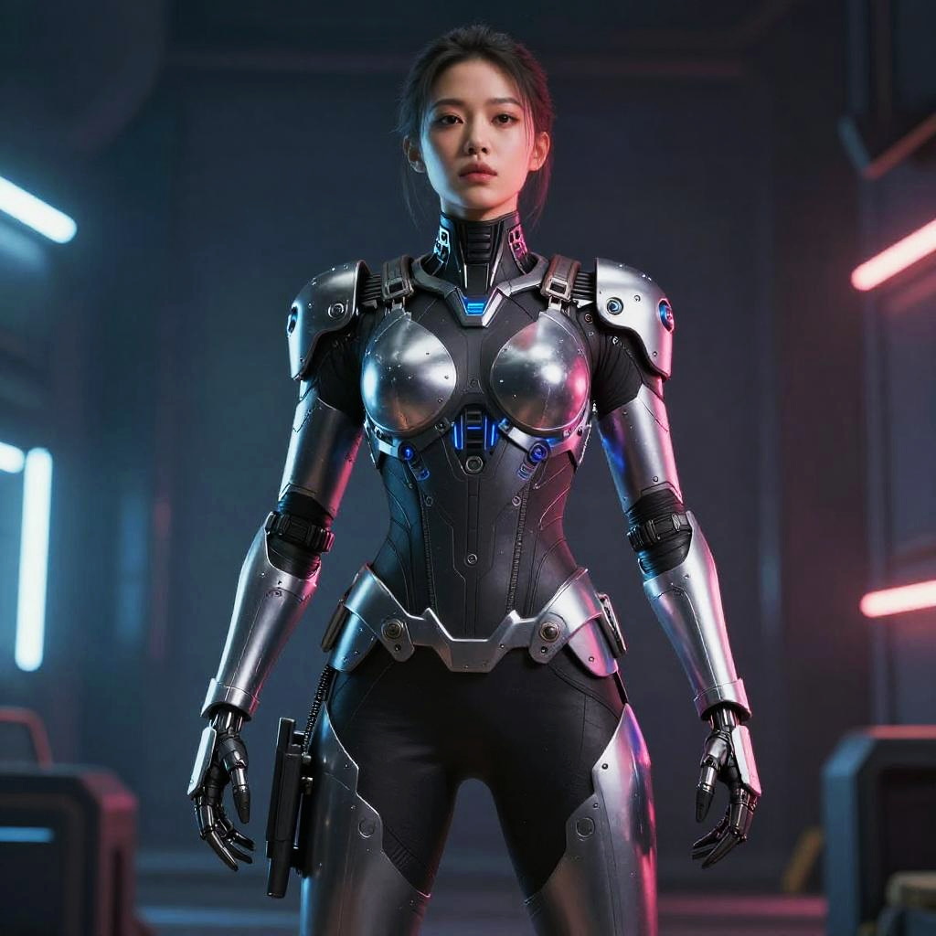 A woman stands confidently in a futuristic high-tech laboratory, wearing a sleek metallic bodysuit paired with matching thigh-high boots. The image combines elements of sci-fi and cyberpunk fashion, set against a backdrop of advanced electronic equipment and cool, blue-toned lighting.