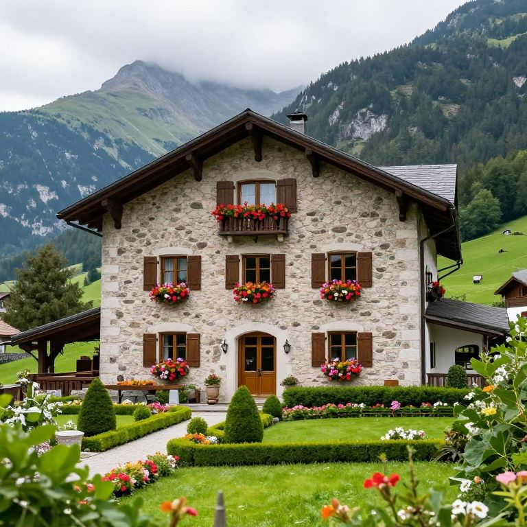 Lush gardens bloom vibrantly along a tranquil riverbank, reflecting a serene countryside scene with a charming house featuring a red-tiled roof nestled amidst verdant trees under a bright, cloud-dotted sky.