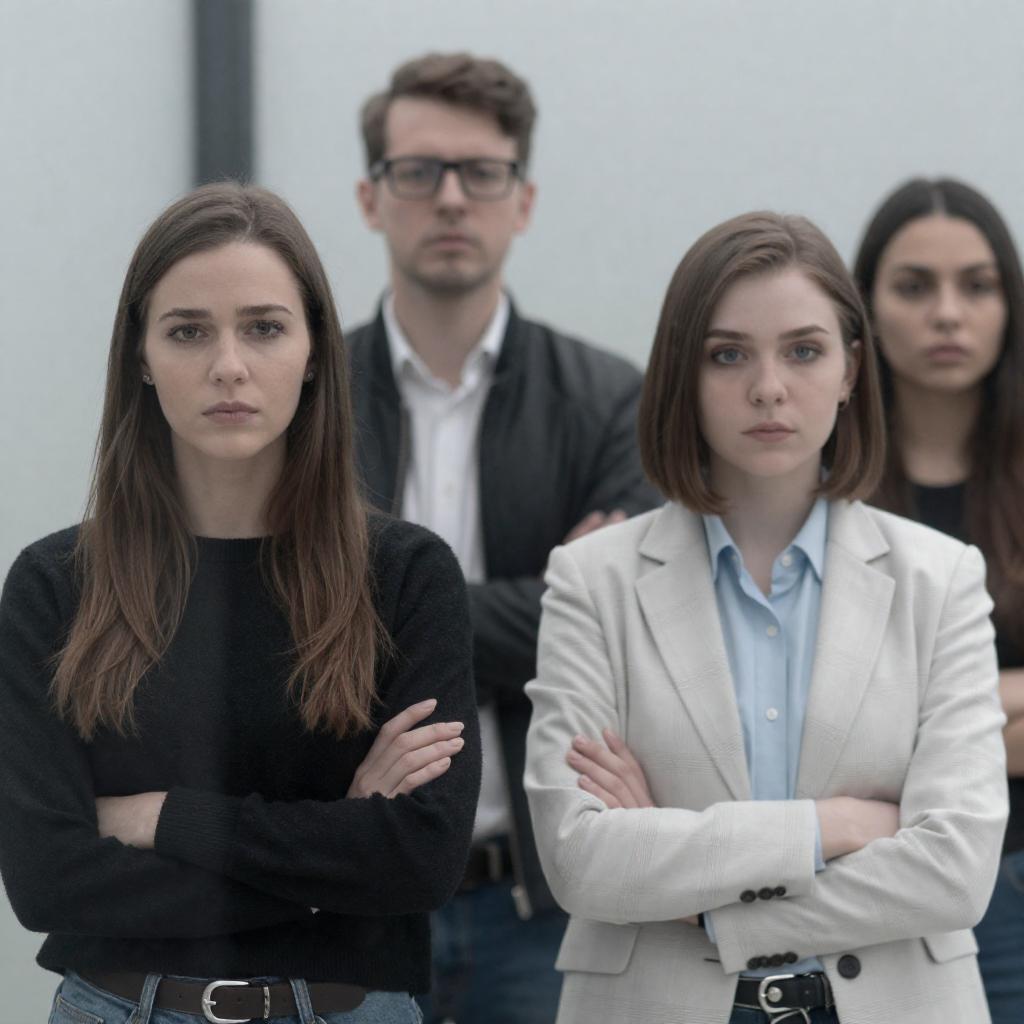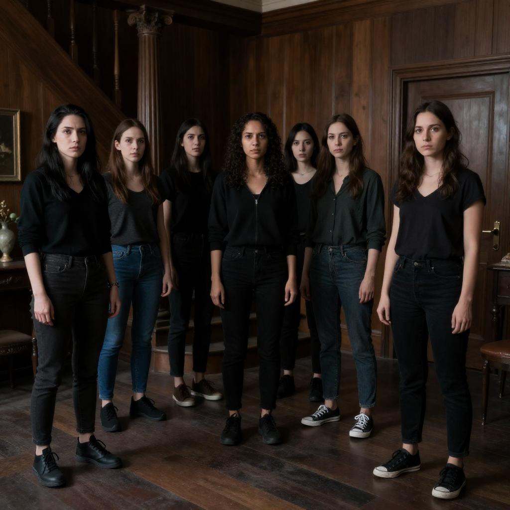 Photograph of a dark, abandoned church with four people. Central figure, long brown-haired woman in black, stands smiling. Three others sit or kneel around her, looking up. Ruined architecture and circular symbol on the floor in background.