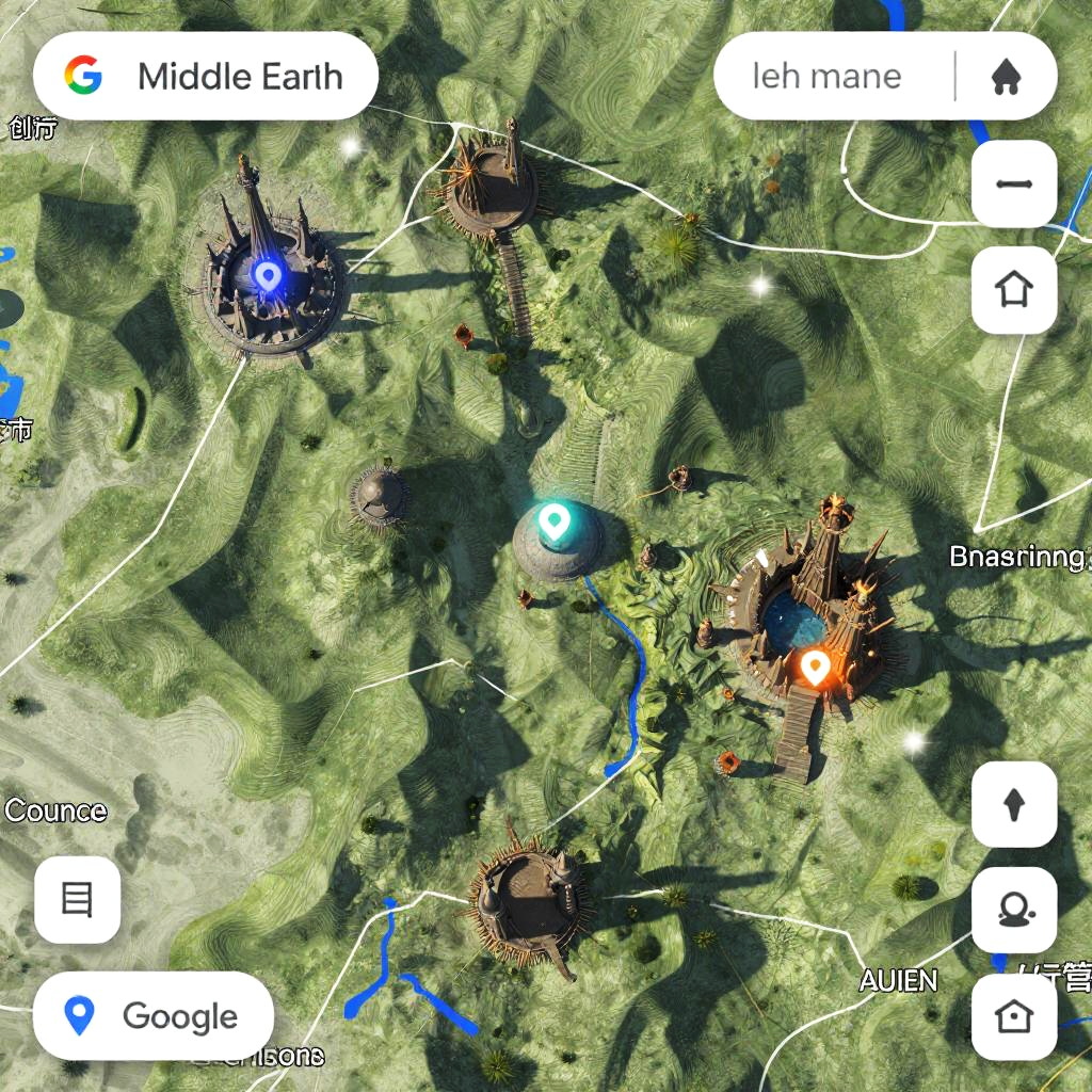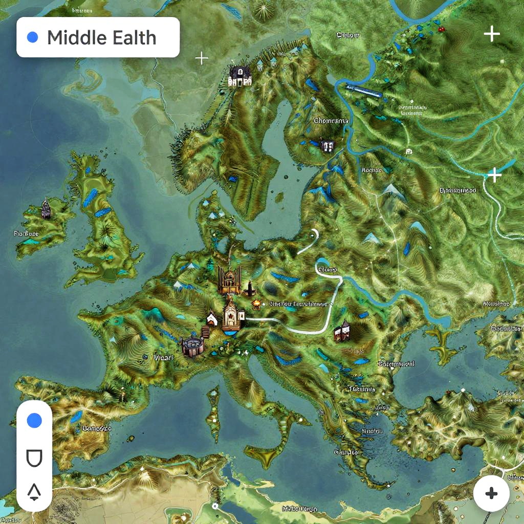 Google Maps Middle Earth, ultra detailed fantasy map, vibrant colors, topographic style, mystical landscapes, mountains and rivers, Tolkien inspired, high resolution digital art
