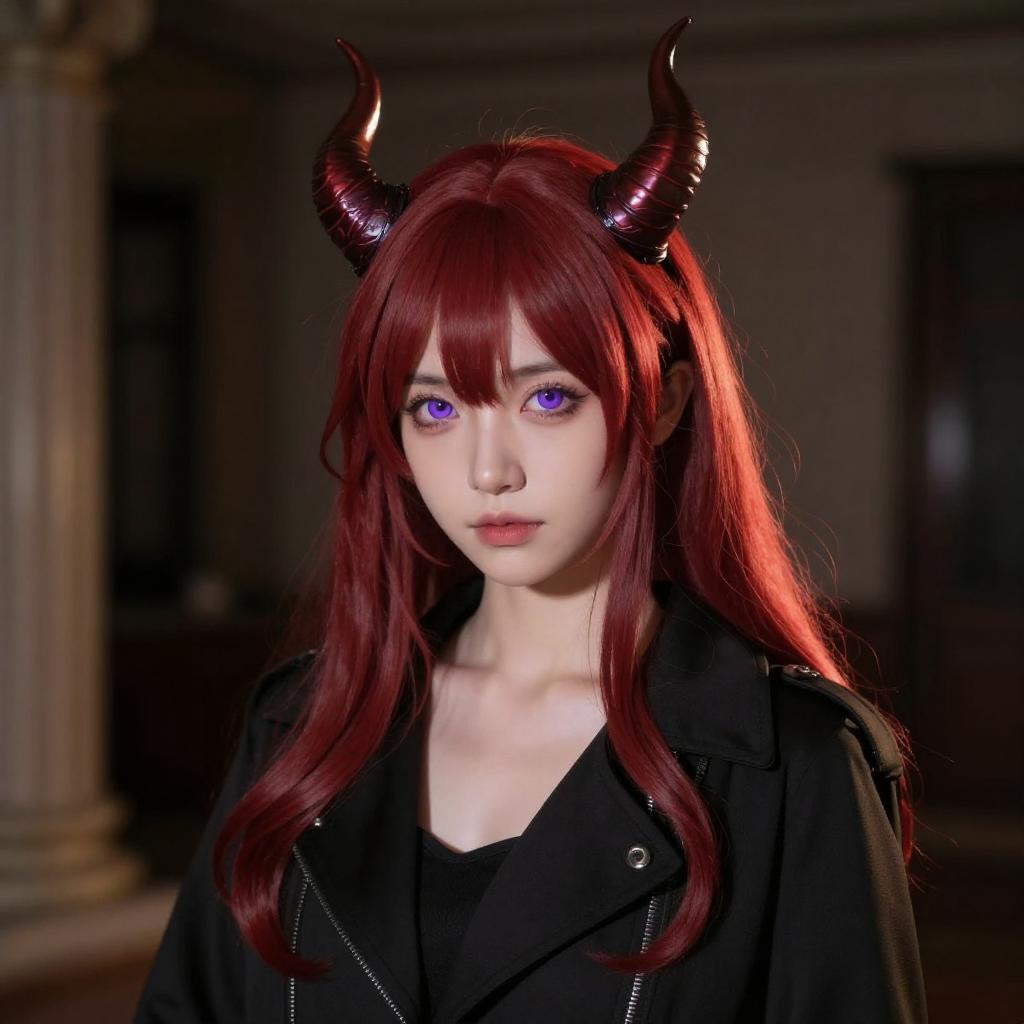 Masterpiece, best quality, upper body, 1girl, looking at viewer, red hair, medium hair, purple eyes, demon horns, black coat, indoors, dimly lit