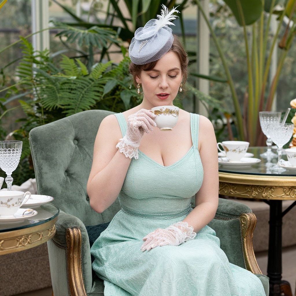 Photograph of a fair-skinned woman with red lipstick and dark brown hair, styled in an elegant updo, wearing a light blue, sleeveless, vintage-style dress with a low neckline and white lace gloves. She sits in a green, tufted armchair, holding a delicate lace handkerchief to her chest. She also wears a white hat adorned with a feather. In the background, lush green plants and a glass window are visible. The table beside her has a gold-trimmed black surface with white china and crystal glasses. The setting evokes a classic, refined atmosphere.