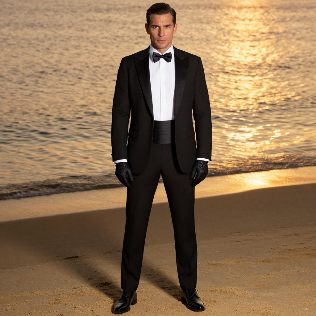 Photograph of a tall, handsome man standing on a sandy beach at sunset. He has short, dark hair, and is wearing a black tuxedo with a white dress shirt and black bow tie. He also wears black gloves and black dress shoes. The background features a calm, golden-hued sea with gentle waves. The man's serious expression contrasts with the serene, warm setting. The lighting creates a reflective glow on the water and sand, highlighting his formal attire. The overall mood is elegant and slightly dramatic.