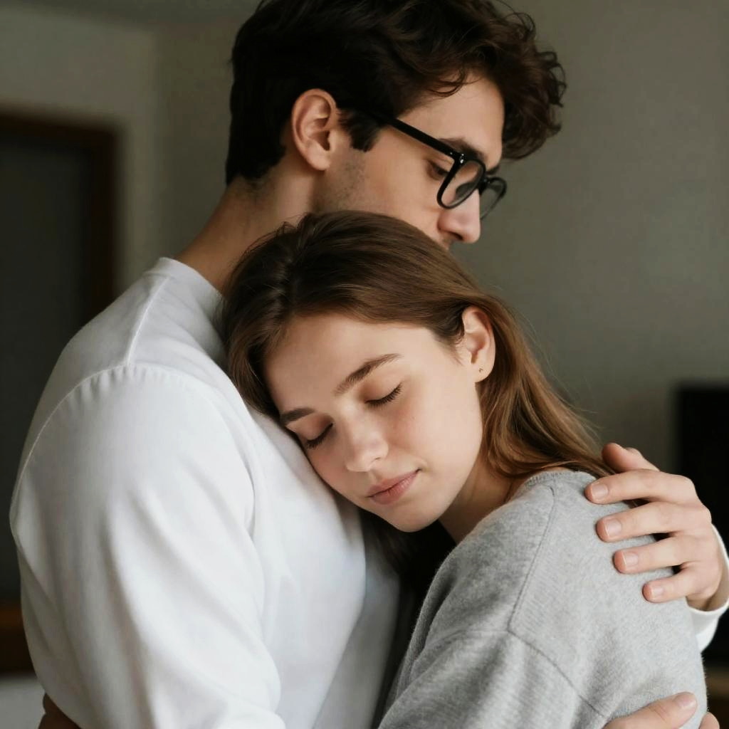 Photograph of a man and woman. Man with dark hair, glasses, white shirt, holding woman's head gently. Woman with light brown hair, closed eyes, wearing gray sweater, leaning on man's shoulder. Man's left hand on woman's head, right hand on her back. Dimly lit background. Intimate, comforting pose.