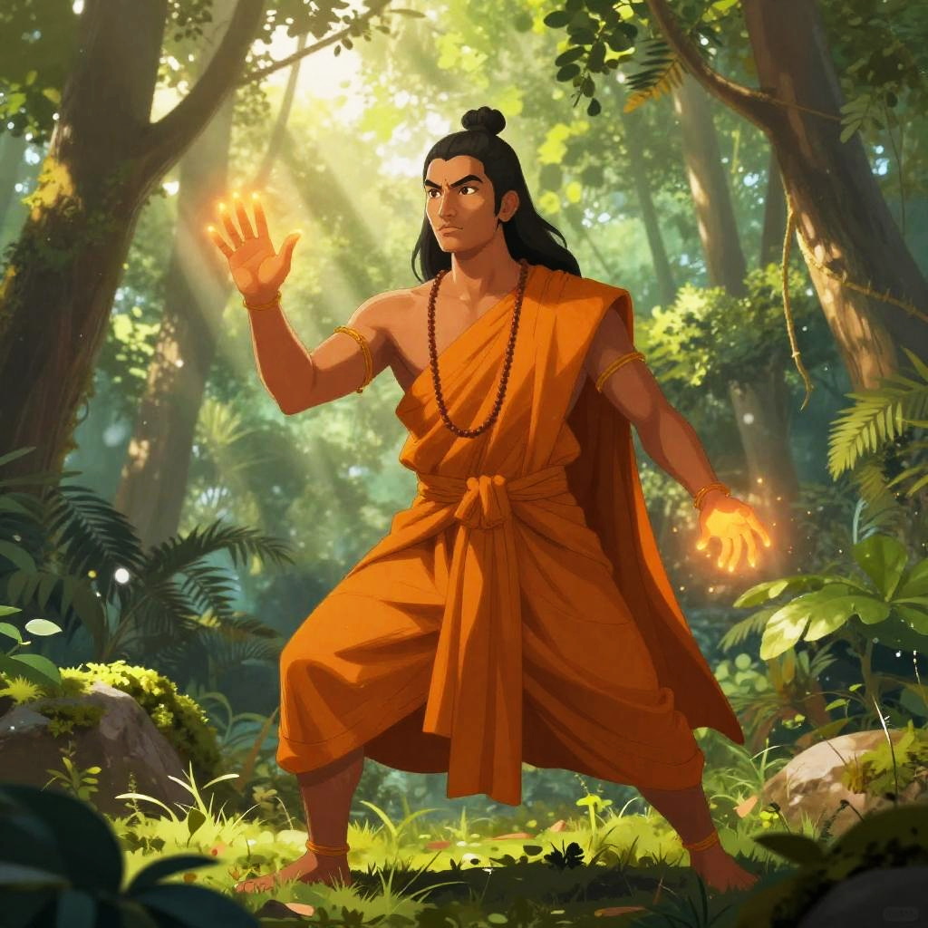 Sankara illustrated as a powerful warrior monk in traditional robes, commanding natural elements with glowing hands, standing in a lush forest with beams of sunlight piercing through dense foliage, vibrant colors and dynamic composition evoking strength and serenity.