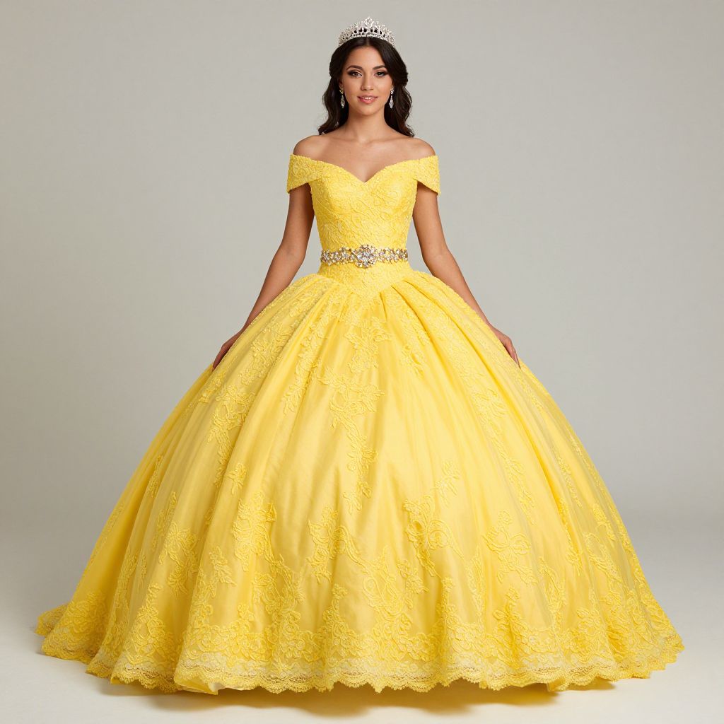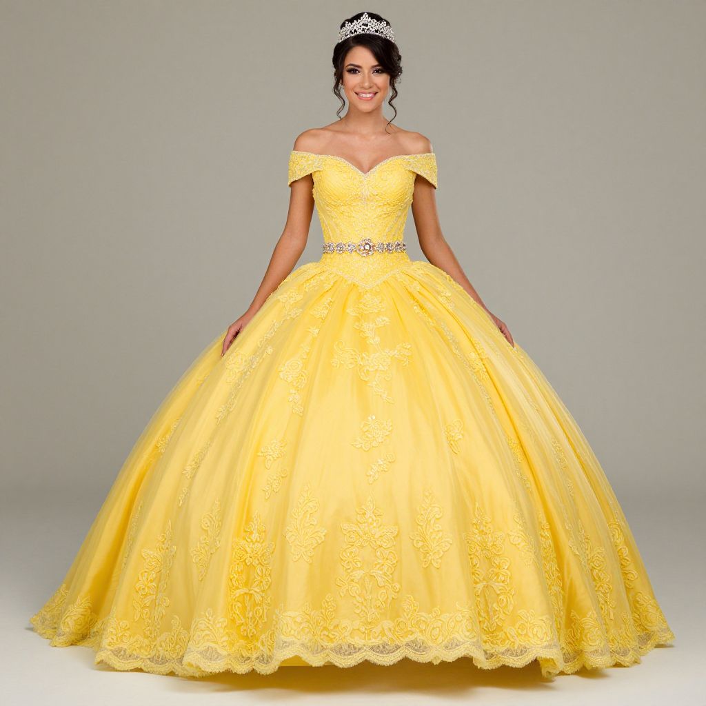 Elegant woman showcasing a vibrant yellow off-shoulder lace ball gown with a sparkling floral belt, perfect for a sweet 16 or quinceañera celebration.