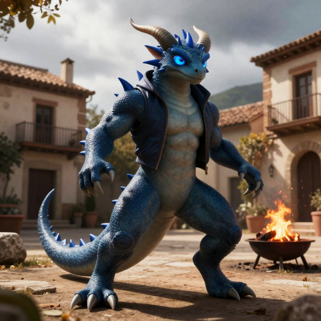 Solo, male, (athletic:0.7), (slim:0.8), (lean), secret agent, (male anthro dragon):1.3, (defensive action pose):1.3, (kemono:0.2), (open jacket), ((clothed)), detailed eyes, large tail, horns, ((bust portrait)), (detailed eyes, blue eyes, glowing eyes):1.1, (outdoors:1.35), altar, village, Spain, old decrepit buildings, autumn, firepit, overcast, (grey sky), day time, sun rays, (particles, firefly, red glowing):1.3, detailed background, photorealistic, realistic hands, 8k hd, (dark shadows, wide dynamic range, hdr), by (by Pino Daeni, (by ruaidri), by virtyalfobo), (best quality, masterpiece:1), furry scalie male anthro vergence, lizard, smooth body, blue teeth, wide-eyed, (dynamic angle), blue nose horn, blue ribbed eyebrows, detailed blue eyes, blue chin spikes, chin frills, spines, blue spikes going down back of neck, (detailed pupils)