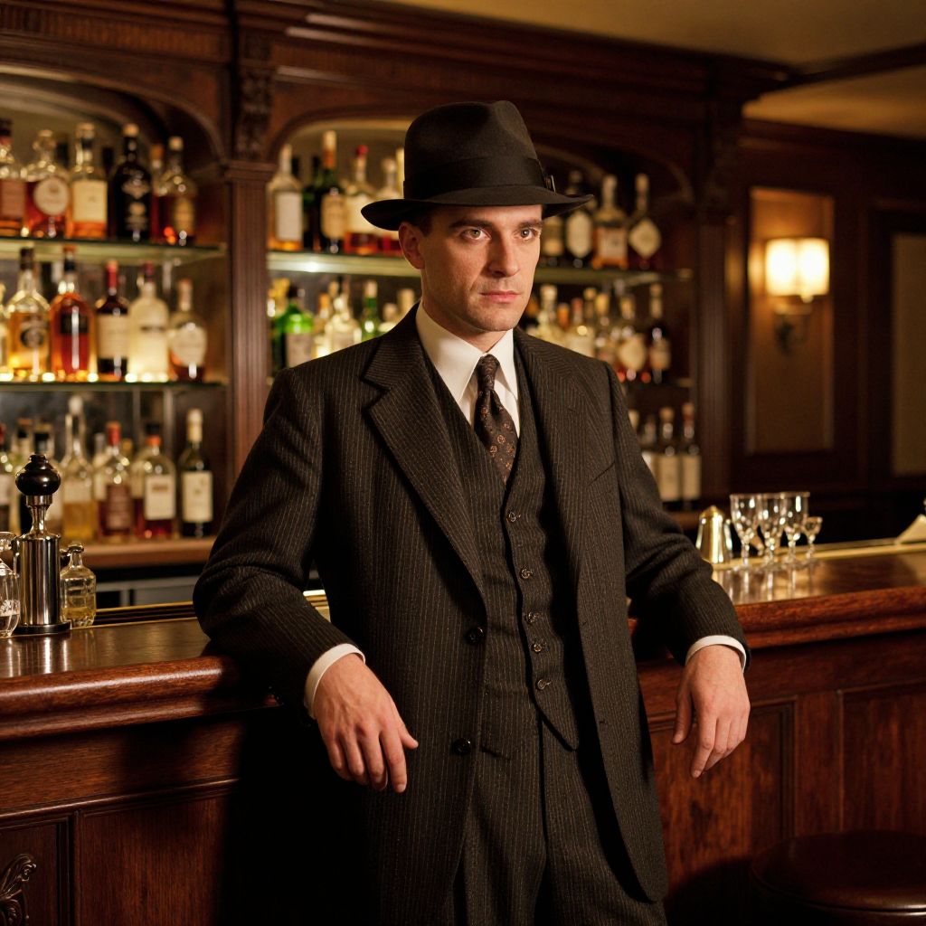 In this 1920s-style bar, a man dressed in a sharp, pinstriped suit and fedora stands confidently at the bar counter, exuding an air of sophistication and mystery. The bar itself is adorned with an array of bottles and glasses, meticulously arranged on shelves and counters, reflecting the era's opulence. The warm, dim lighting casts a golden hue over the scene, enhancing the vintage ambiance. The man's attire, complete with a crisp white shirt and a neatly tied tie, contrasts sharply with the rich, dark wood of the bar and the polished surfaces of the bottles. The overall composition is balanced, with the man positioned centrally, drawing the viewer's eye to his commanding presence and the intricate details of his attire and the surrounding environment.