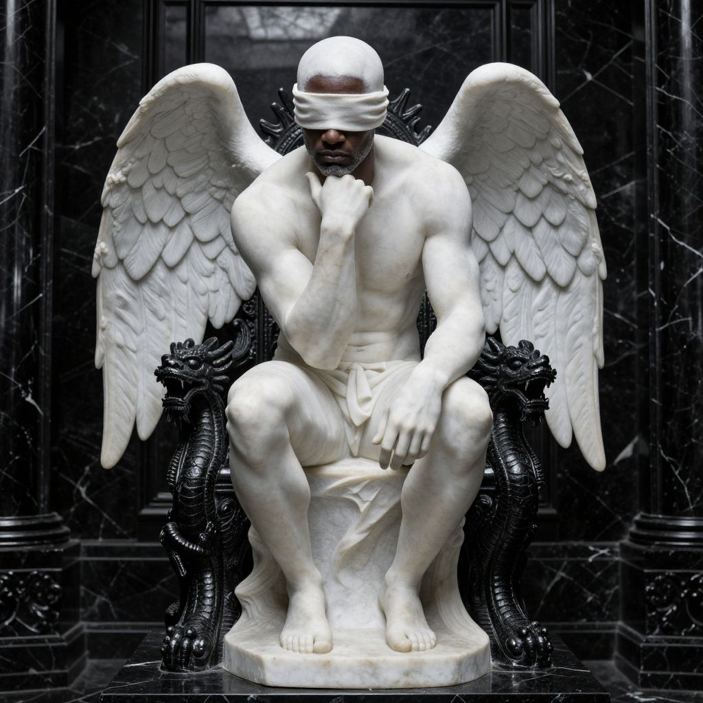 Photorealistic digital art of a muscular, white marble angel with large wings, blindfolded, squatting on an ornate black chair against a