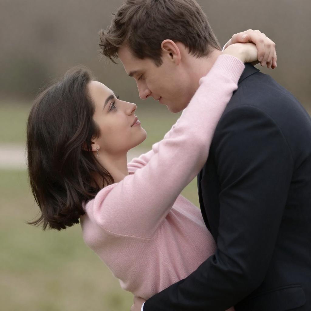 Photograph of a romantic scene featuring a man and woman in a close embrace. The man, with short brown hair and a black suit, leans over the woman, who has dark hair and wears a pink sweater. They gaze into each other's eyes against a blurred, outdoor background. The man's right arm wraps around her back, while her left arm rests on his shoulder.