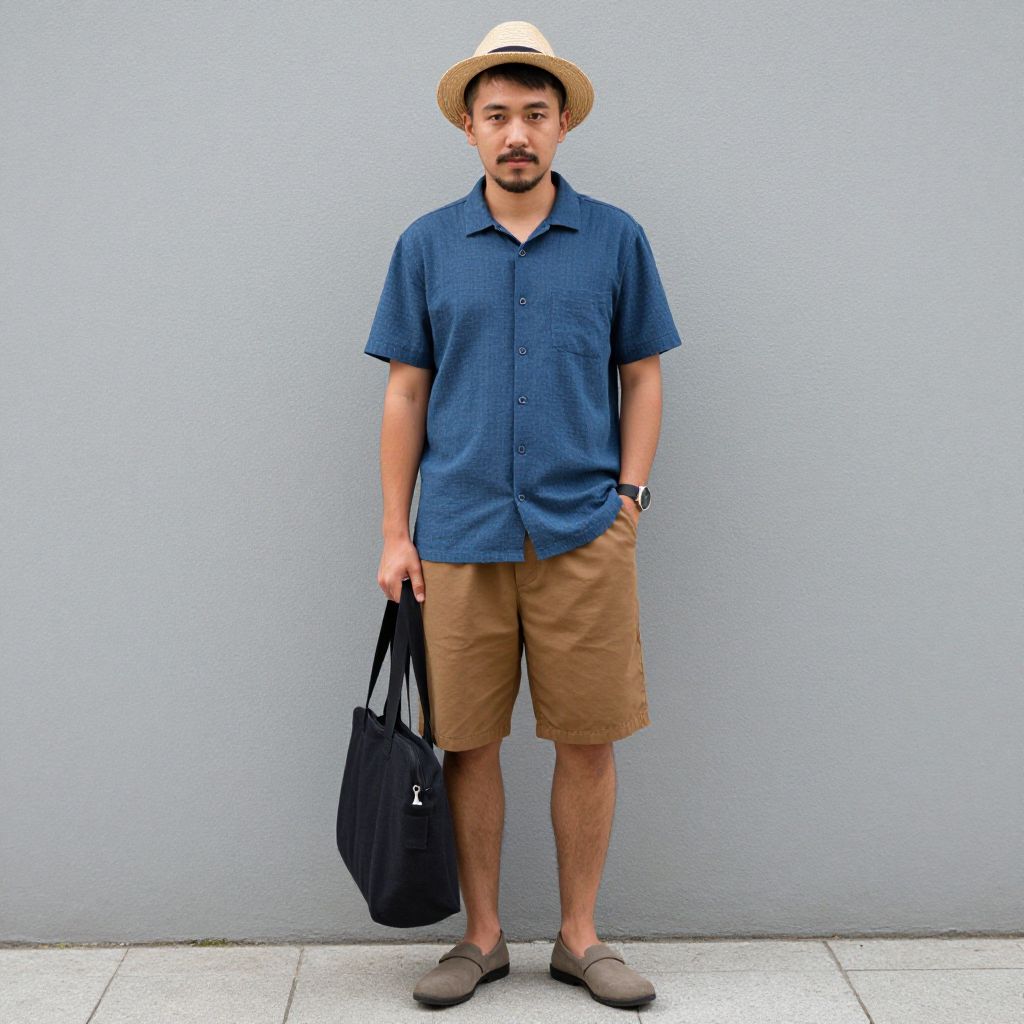 Photograph of an Asian man standing against a plain light gray wall. He has a medium build, short black hair, and a trimmed beard. He wears a beige straw hat, a short-sleeved blue button-up shirt, beige knee-length shorts, gray slip-on shoes, and a black wristwatch. He holds a black duffel bag in his left hand and has his right hand in his pocket. The ground is tiled in light gray. The image has a clean, minimalistic style with a slight color contrast between his clothing and the background.