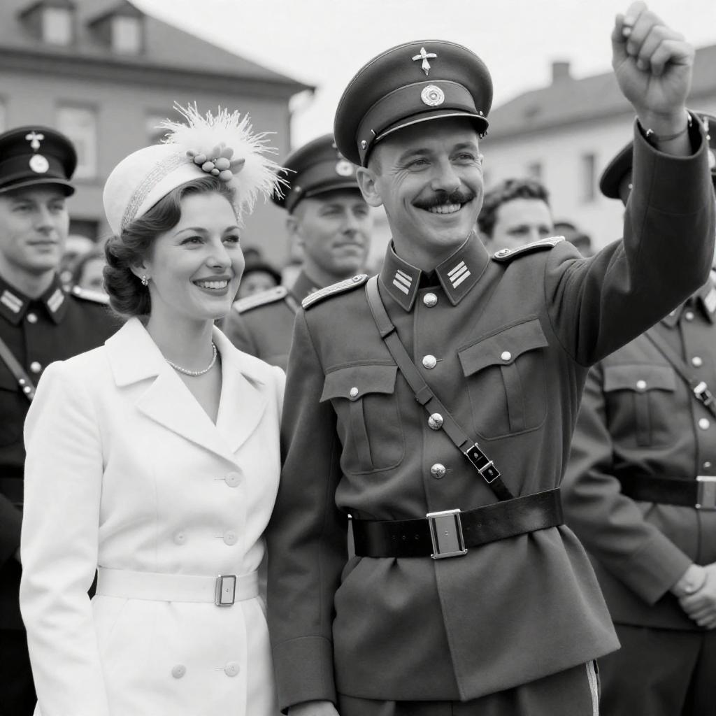 Black and white photograph of a group of people. Central male in Nazi uniform, mustache, arm raised, smiling. Beside him, smiling woman in elaborate hat, white coat. Background includes other smiling people, some in uniforms. Outdoor setting with buildings.