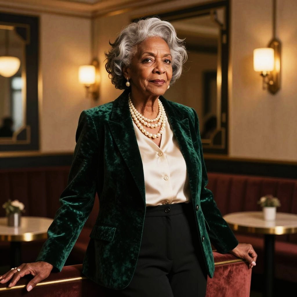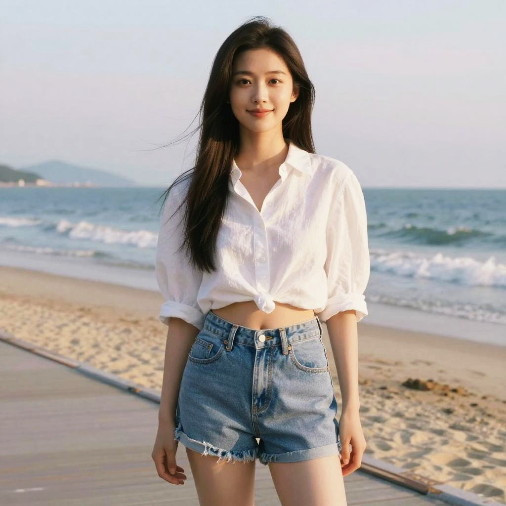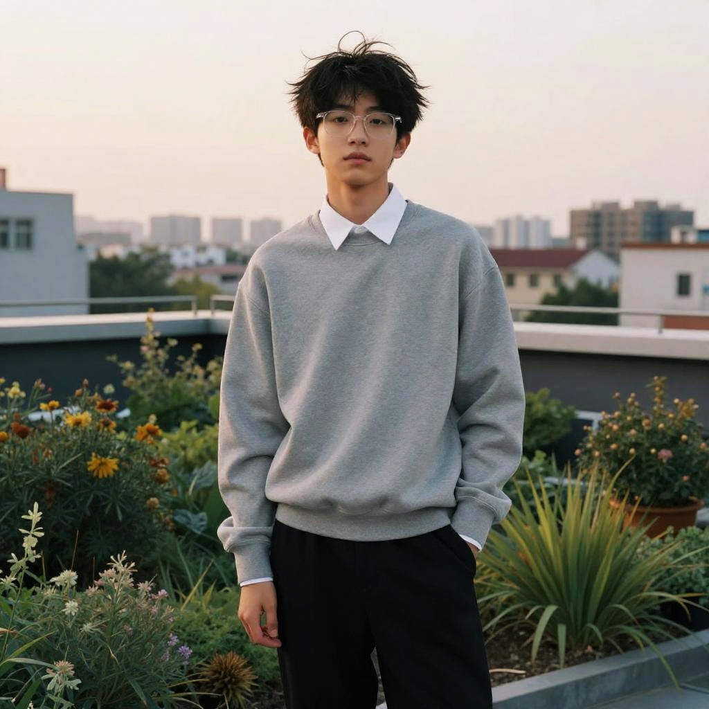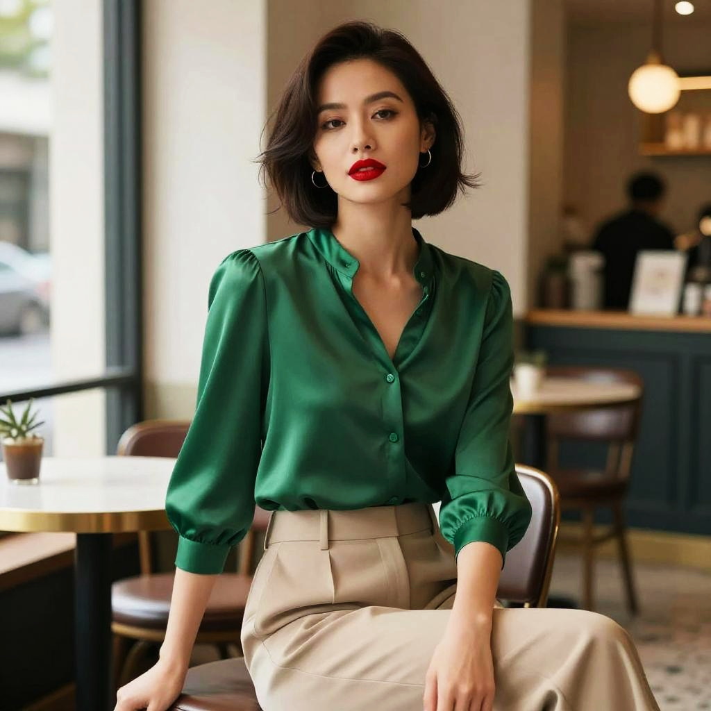 Cinematic fashion portrait of adult East Asian woman with asymmetrical bob haircut and soft coral lipstick, set in chic urban rooftop garden at dawn with misty skyline and string fairy lights, wearing flowy powder blue chiffon blouse with ruffled neckline paired with white wide-leg trousers. Soft rim lighting, warm golden glow, shallow depth of field, subtle film grain, high detail, photorealistic editorial vibe; relaxed three-quarter pose, wind-tousled hair, confident gaze.