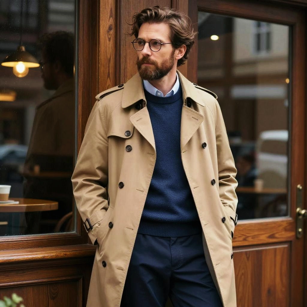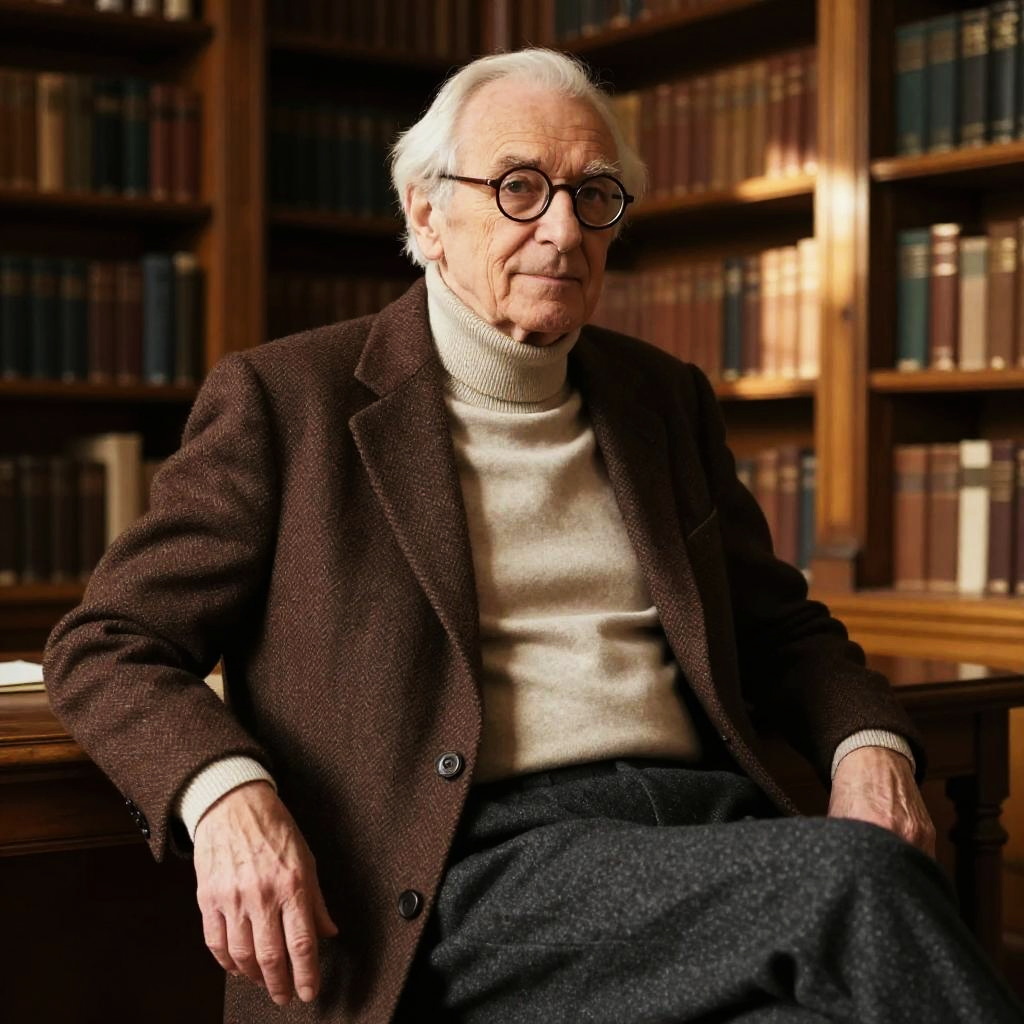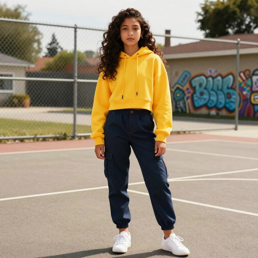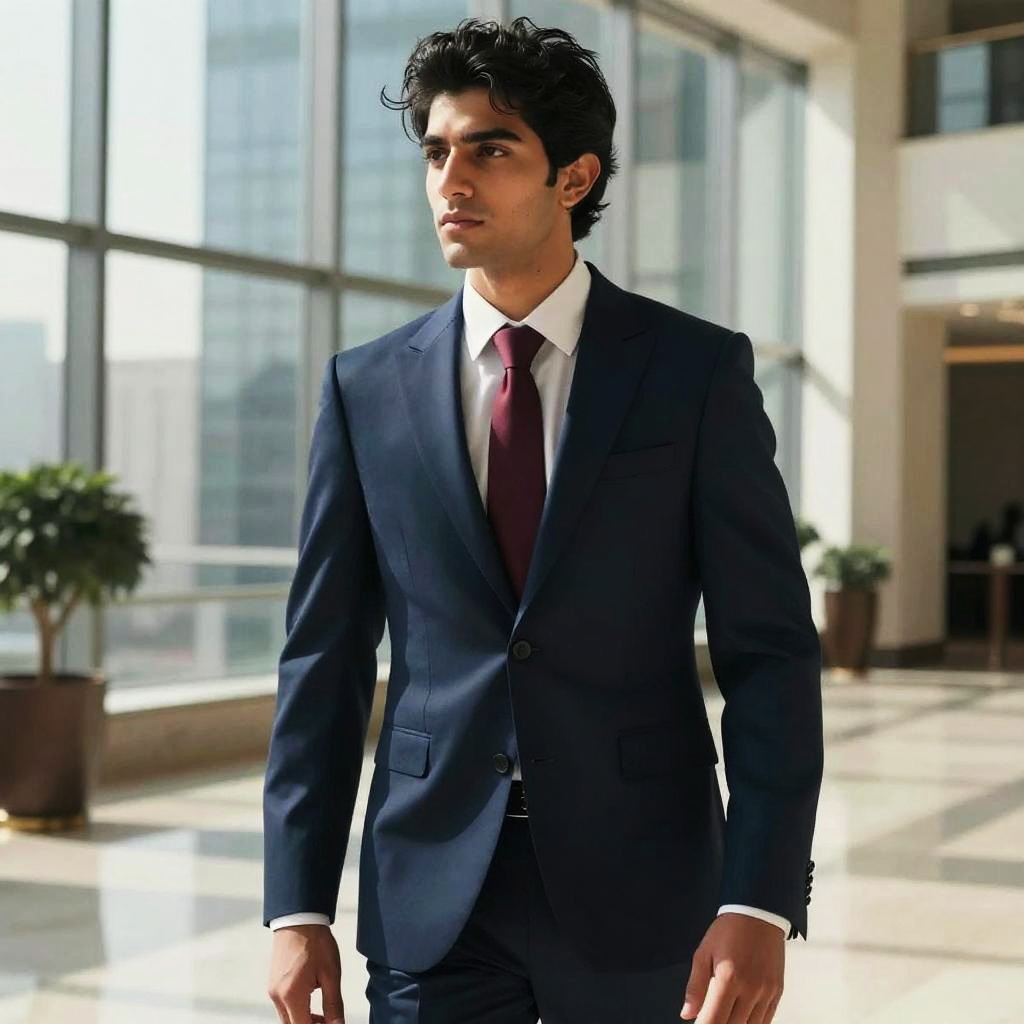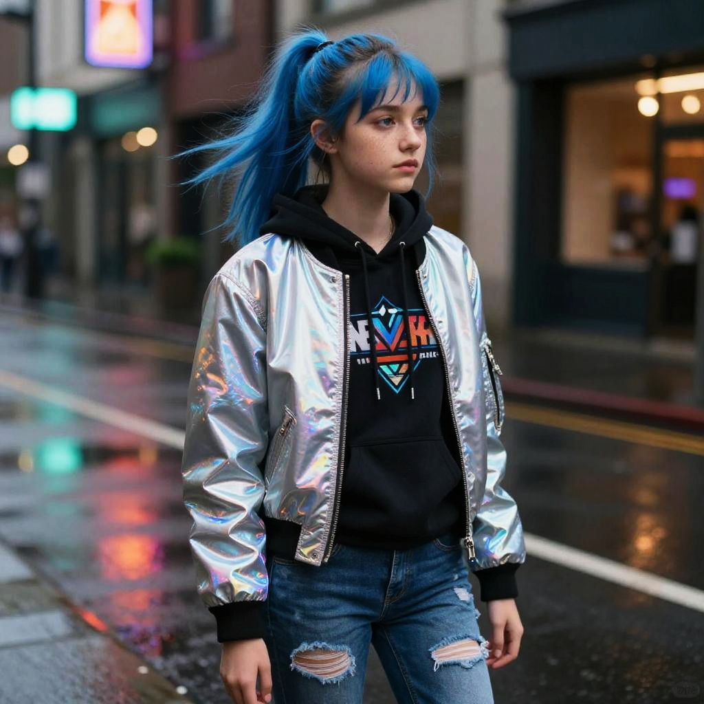 Cinematic fashion portrait of adult East Asian woman with asymmetrical bob haircut and soft coral lipstick, set in chic urban rooftop garden at dawn with misty skyline and string fairy lights, wearing flowy powder blue chiffon blouse with ruffled neckline paired with white wide-leg trousers. Soft rim lighting, warm golden glow, shallow depth of field, subtle film grain, high detail, photorealistic editorial vibe; relaxed three-quarter pose, wind-tousled hair, confident gaze.