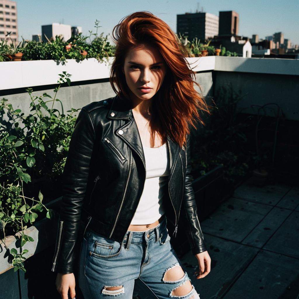 Young woman with auburn hair wearing a black leather jacket, white crop top, and ripped blue jeans standing in a rooftop garden. The photo is styled in a fashion editorial manner with strong shadow contrast, urban buildings in the background, and natural greenery around.