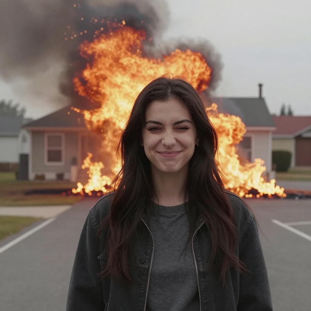 Absurdres, best quality, outdoors, road, house, fire, burning, explosion, 1girl, (portrait), evil smile, looking at viewer, closed mouth, (half-closed eyes:0.9), smug
