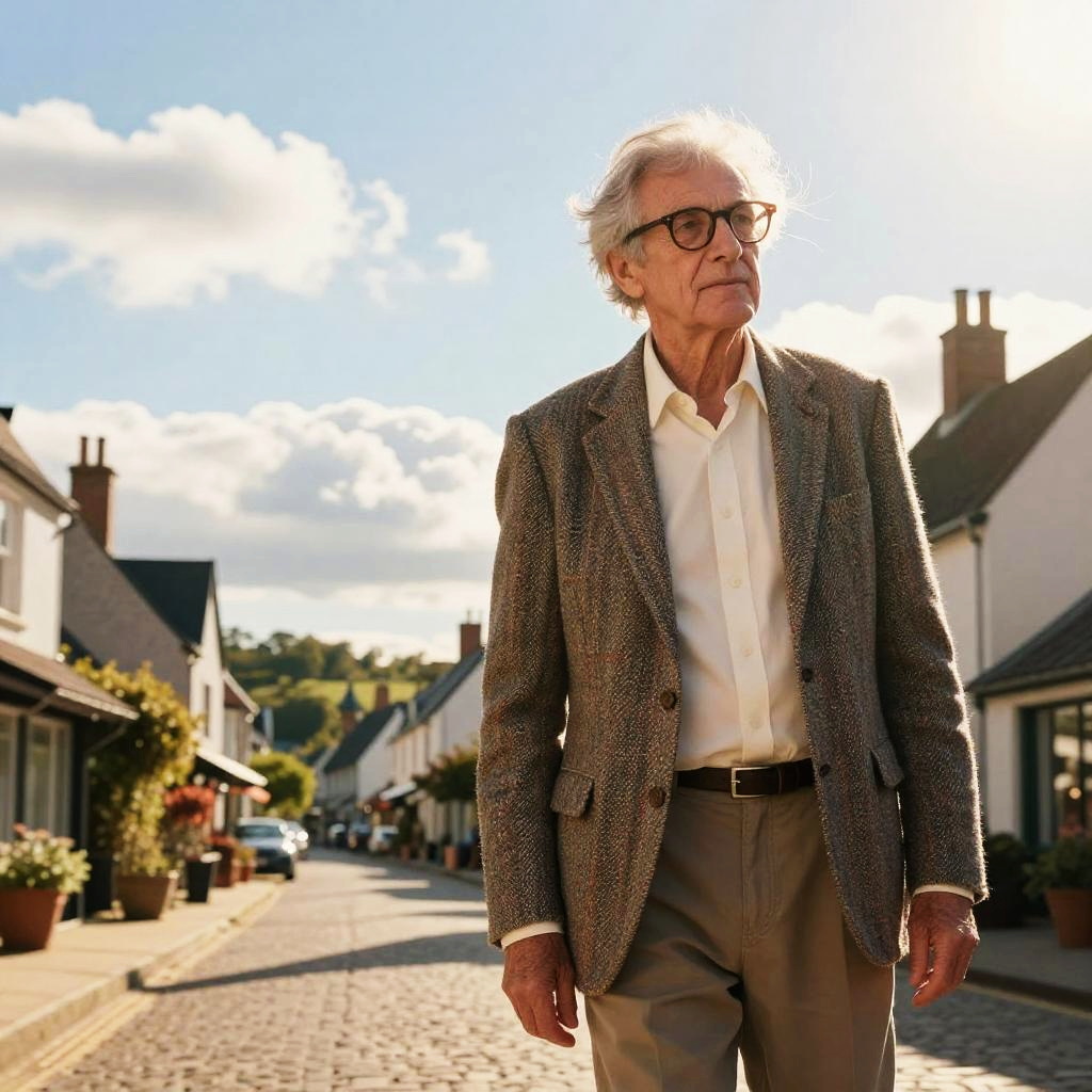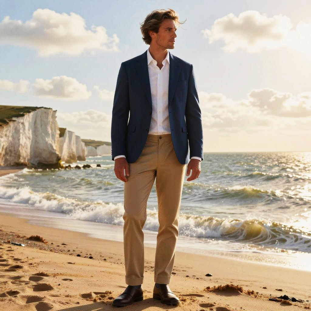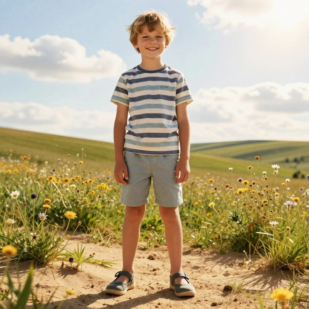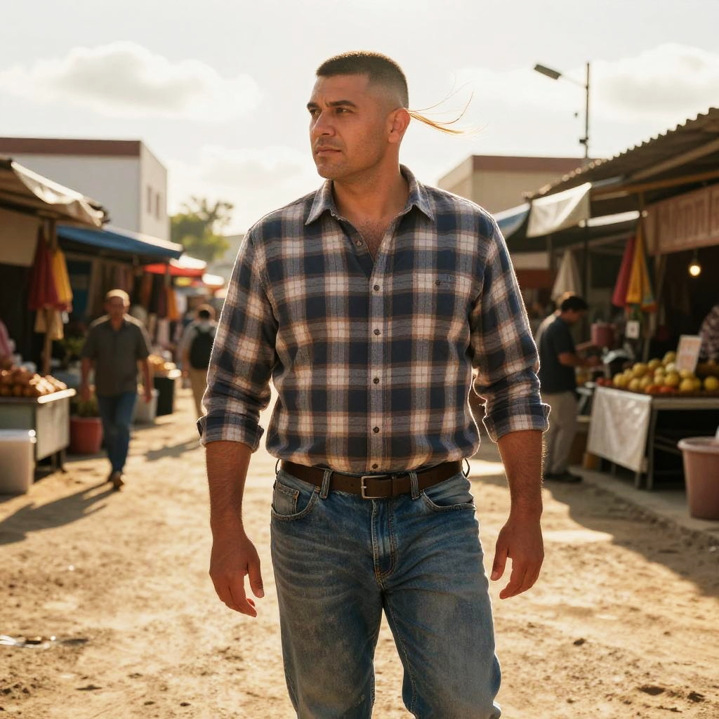 Natural-light editorial photograph of stocky young man with tight curly dark brown hair at sunlit urban basketball court surrounded by tall chain-link fences, wearing bright orange sleeveless sports jersey and black athletic shorts. Golden hour glow, gentle breeze lifting hair, soft rim light, vibrant yet natural color, clean horizon, balanced rule-of-thirds framing, subtle sun flare, realistic skin texture, shallow depth of field, confident stance casting a soft shadow on warm sand, scattered clouds adding depth, professional outdoor fashion aesthetic.