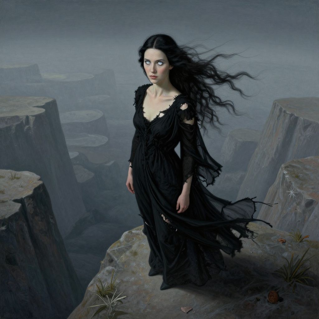 A surreal portrait captures an enigmatic female figure standing on the precipice of infinity, her silver eyes piercing into the abyss below. The subject's flowing midnight hair and tattered black gown billow in an unseen wind, creating a stark contrast against the endless void behind her. This haunting scene is depicted from a bird's-eye perspective, evoking feelings of awe, fear, and introspection as the woman gazes into the unknown depths, reminiscent of Dali-esque surrealist paintings.