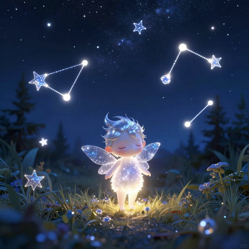 Photograph of a glowing, cartoon fairy standing in a grassy meadow at night. The fairy has blue, sparkling wings, a tuft of blue hair, and a soft, white face with closed eyes. It emits a bright, ethereal light from its body. Surrounding the fairy are glowing blue stars connected by white lines, forming constellations in the dark, starry sky. The background features silhouetted pine trees and scattered small flowers. The scene is magical and whimsical, with a deep blue night sky and a sense of enchantment.