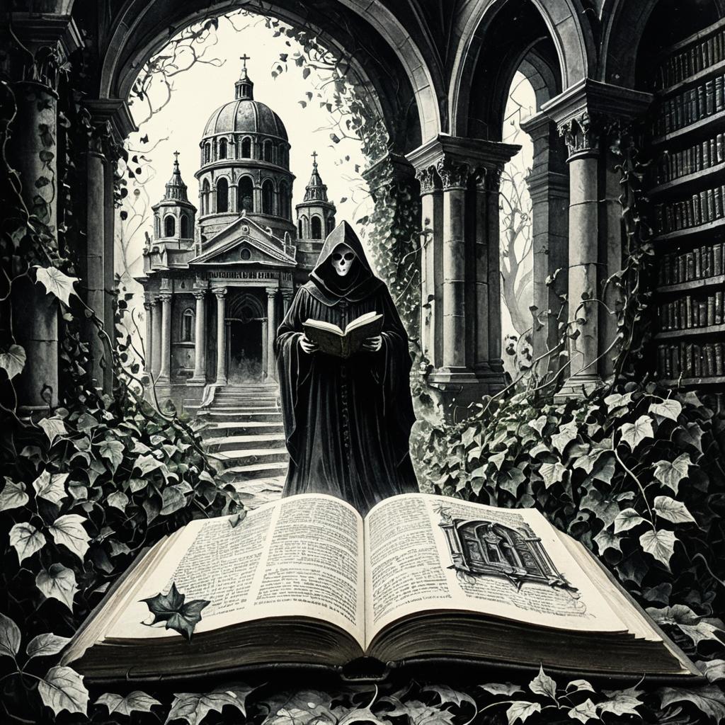 Dark fantasy illustration of a phantom librarian clad in a black hooded robe and skeletal face emerging from spectral book pages. The scene is set in a forgotten basilica surrounded by crawling ivy and hidden alcoves, rendered in intricate ink wash style with detailed architectural and botanical elements.