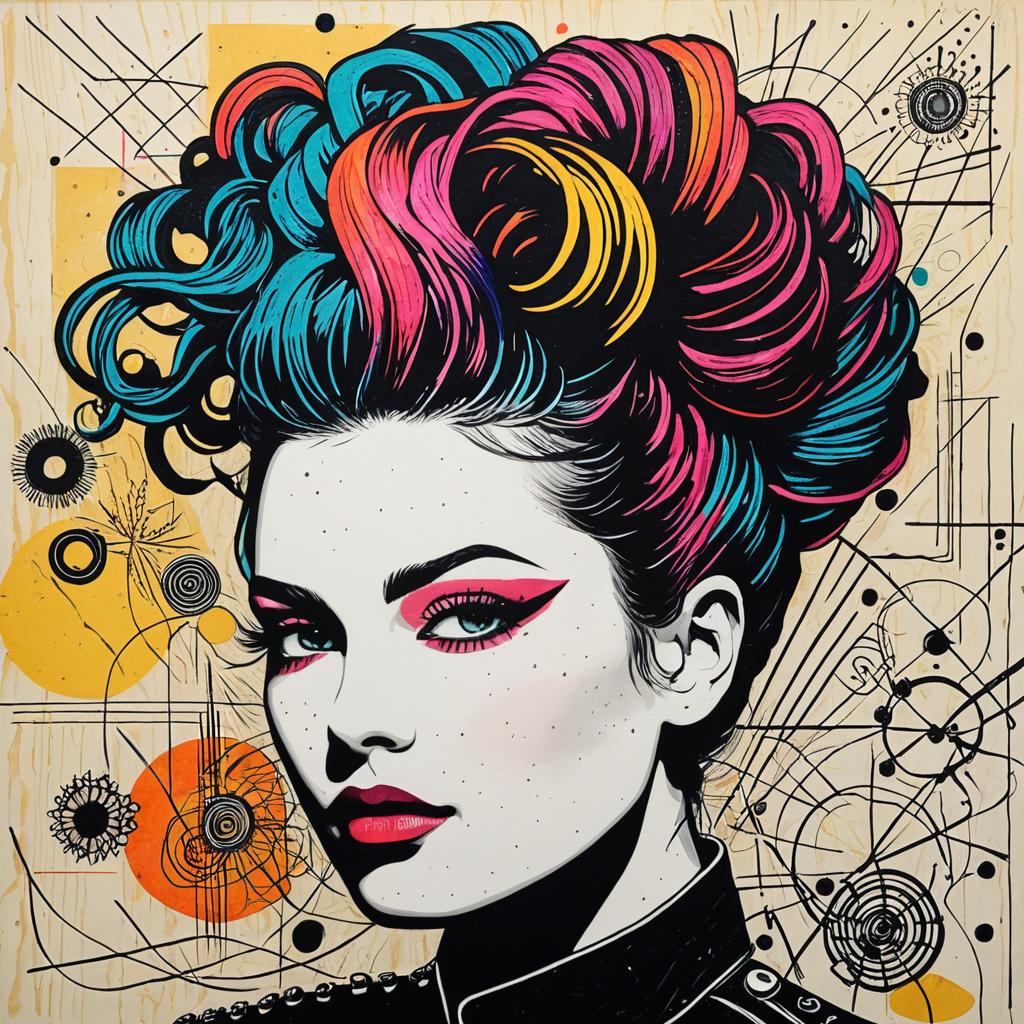 A vibrant, colorful artwork of a woman with an elaborate, abstract hairdo and striking makeup. The piece features black inking outline with luminous coloring on an encaustic-textured surface, combining techniques like decoupage and impasto. Inspired by Android Jones and Beatriz Milhazes, the artwork fuses elements of lyco art, punk art, and pop art to create a bold and energetic composition. The colors are vivid, with a layered, textured finish that evokes a sense of dynamic movement and modern artistic expression.