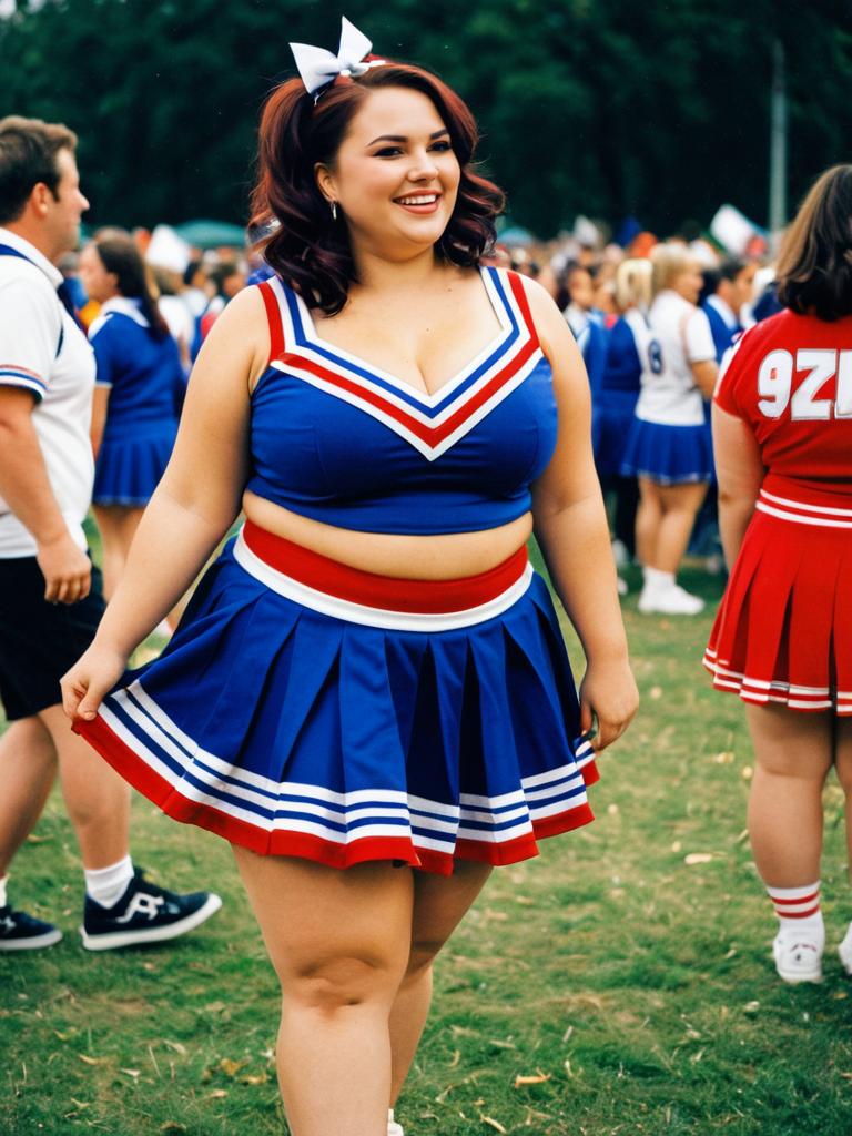 Woman in Plus Size Cheerleader costume, candid cosplay portrait at festival