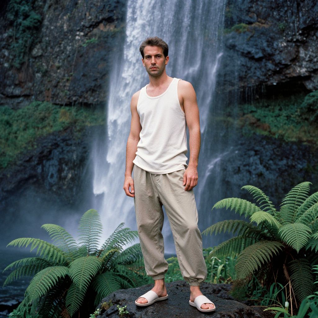 A man, breezy tank top, soft cream, loose-fit khaki joggers, minimalist slide sandals, majestic cliffs, cascading water, lush green ferns, kodachrome analog film, relaxed expression, enjoying nature.Man has masculine face and piercing eyes