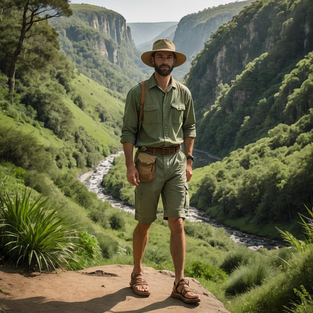 Photo of a Athletic man, Shadow Fade, safari outfit, khaki long-sleeve in Fern Green, cargo shorts in Hemp Tricot, wide-brim hat, leather sandals, utility belt, adventure-ready, hidden valley, illustrative realism