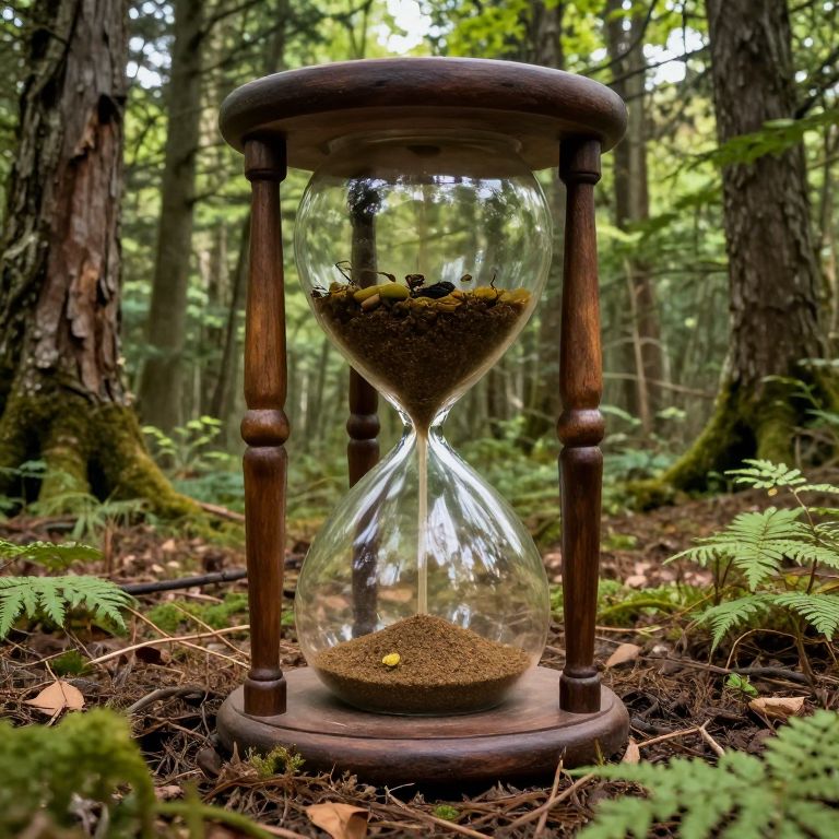 Wooden hourglass with moss-covered sand, standing in a lush, sunlit forest, surrounded by ferns and fallen leaves. Photographic realism.