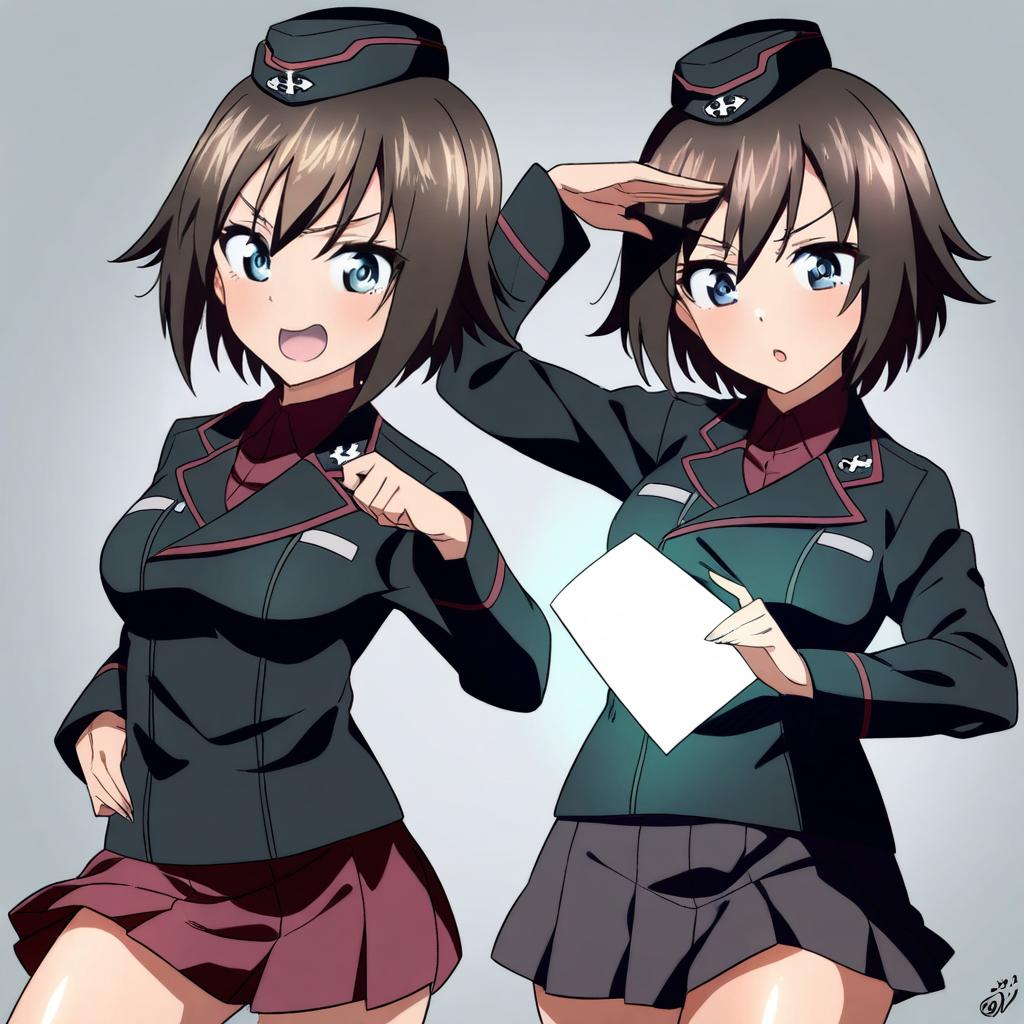 Hida ema, girls und panzer, 1girl, blue eyes, short hair, brown hair, medium breasts, kuromorimine military uniform, military uniform, kuromorimine military uniform, black jacket, dress shirt, garrison cap, red shirt, military uniform, pleated skirt, long sleeves, wing collar, insignia, by artist nightcat, animagine